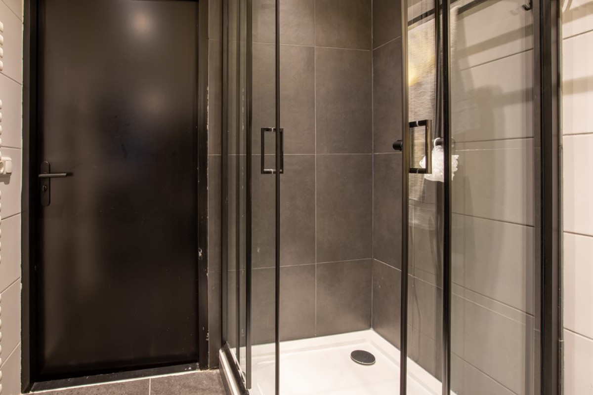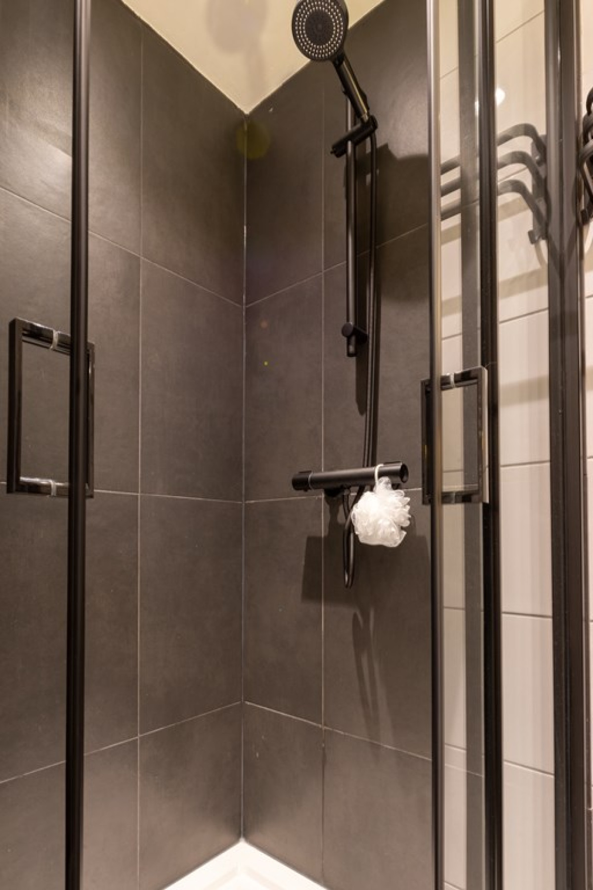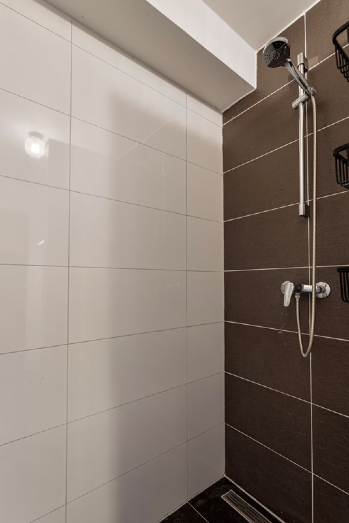 Vanuit de hal heb je toegang tot de badkamer op de begane grond, voorzien van een wastafelmeubel en inloopdouche.