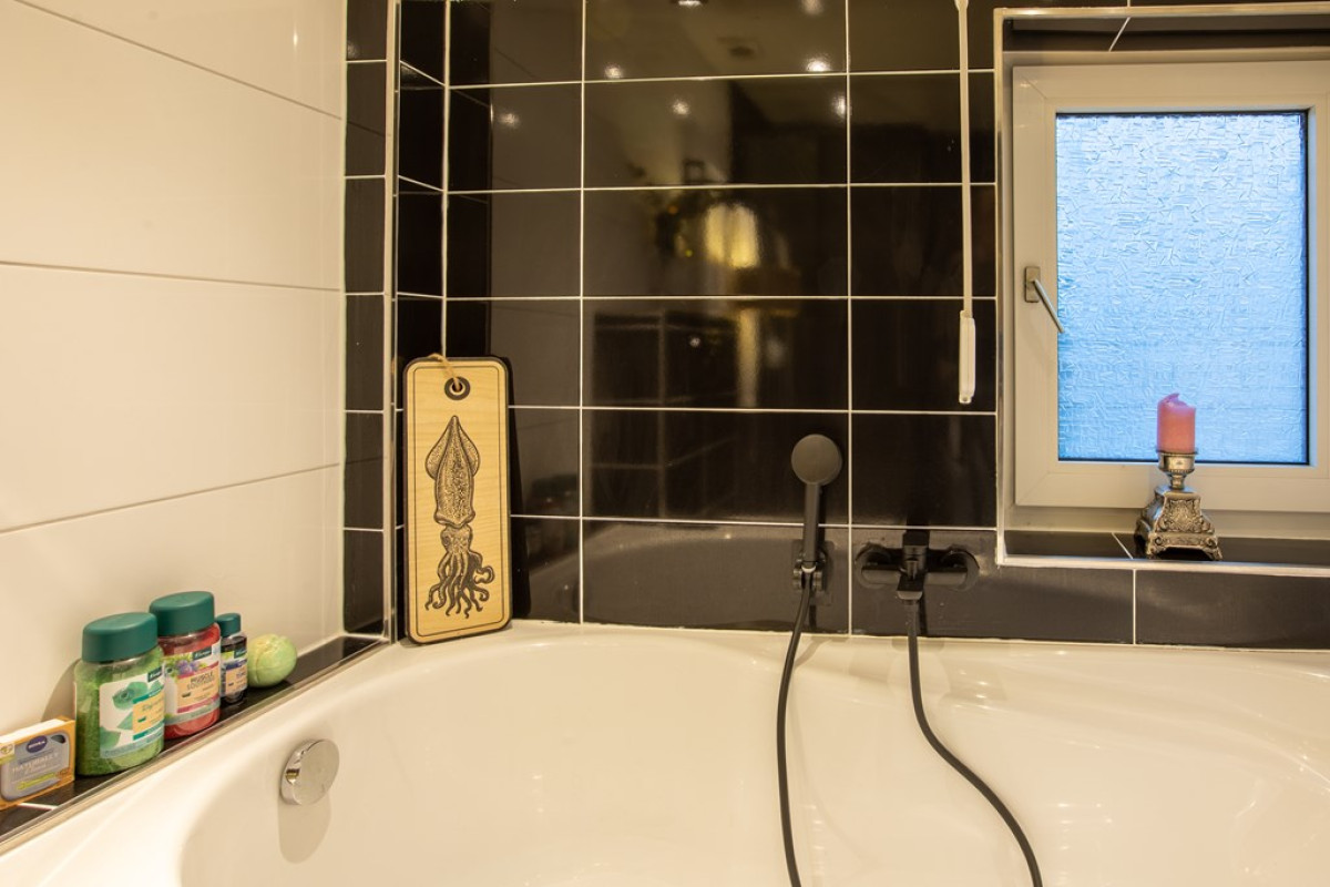 De badkamer is uitgerust met een bad, wastafelmeubel, toilet en douche.