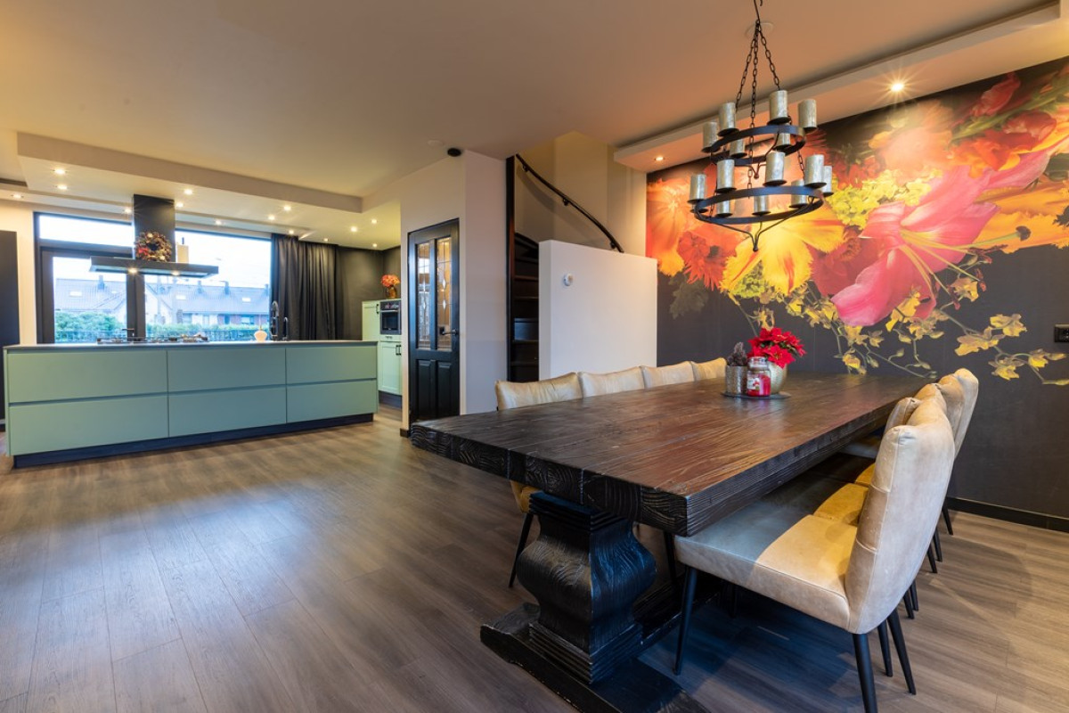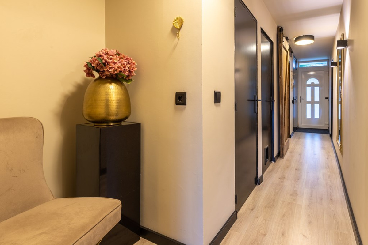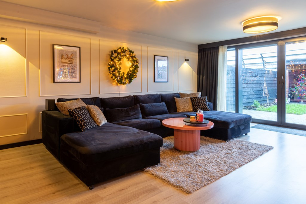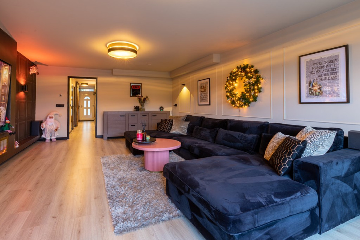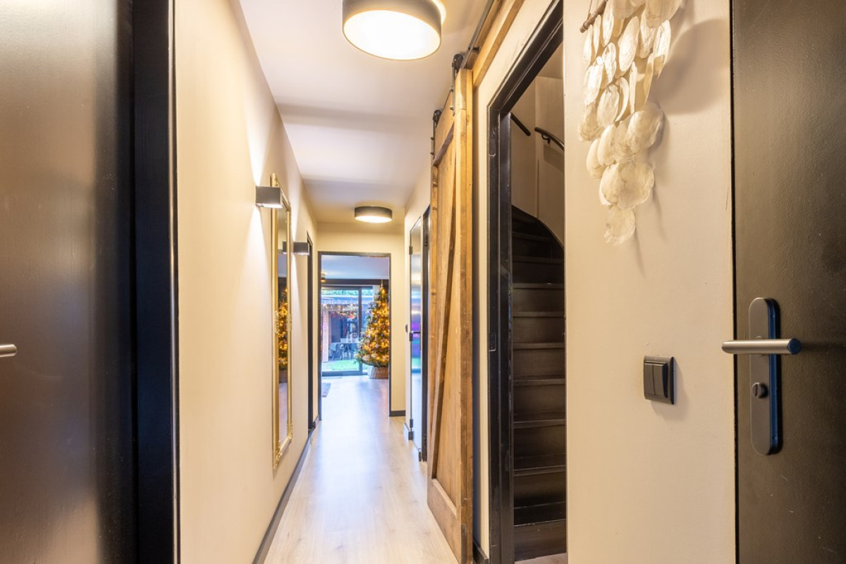 Vanuit de hal stap je ook binnen in de ruime uitgebouwde woonkamer (2018) met een schuifpui over de volledige breedte van de woonkamer en uitzicht op de sfeervolle achtertuin.