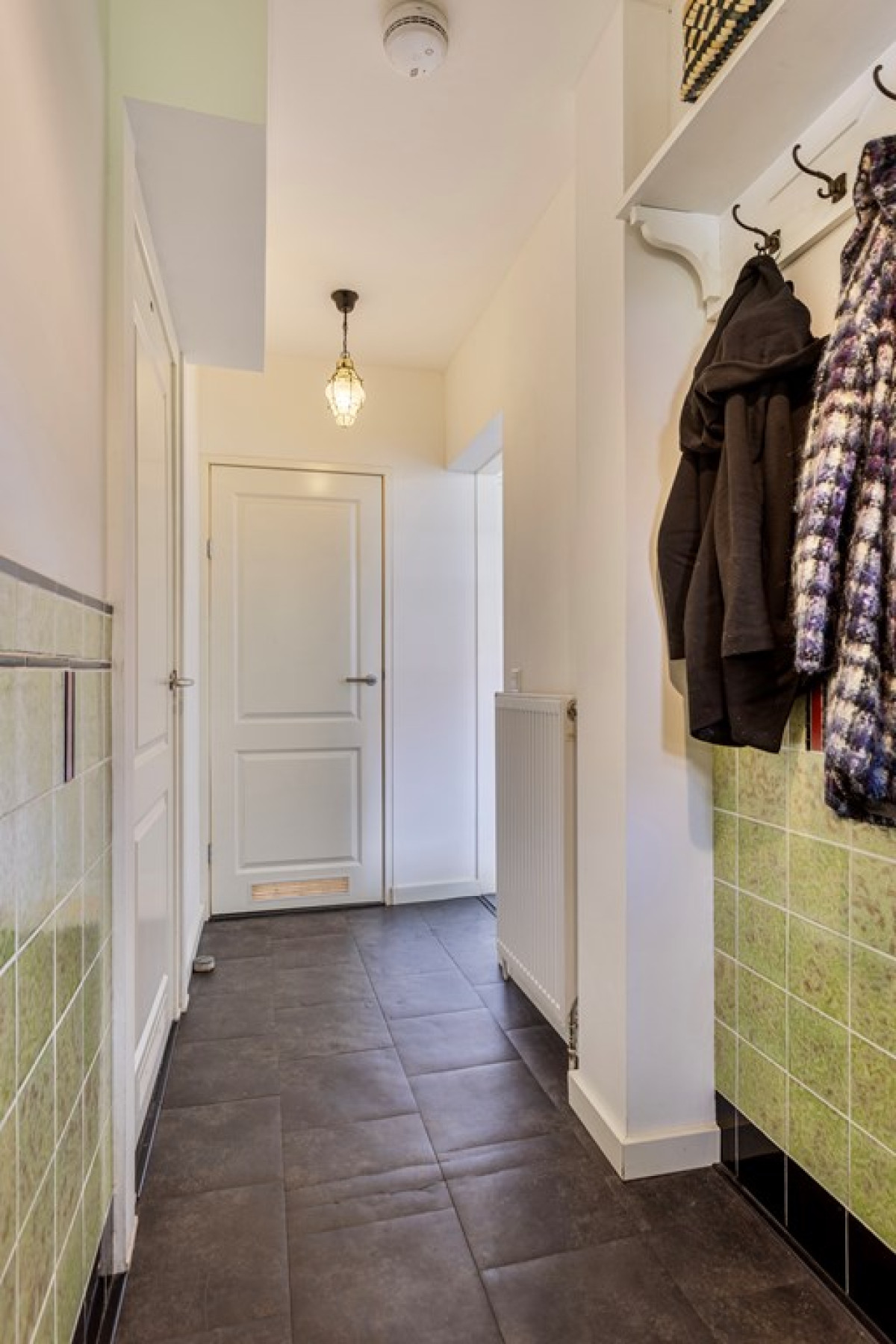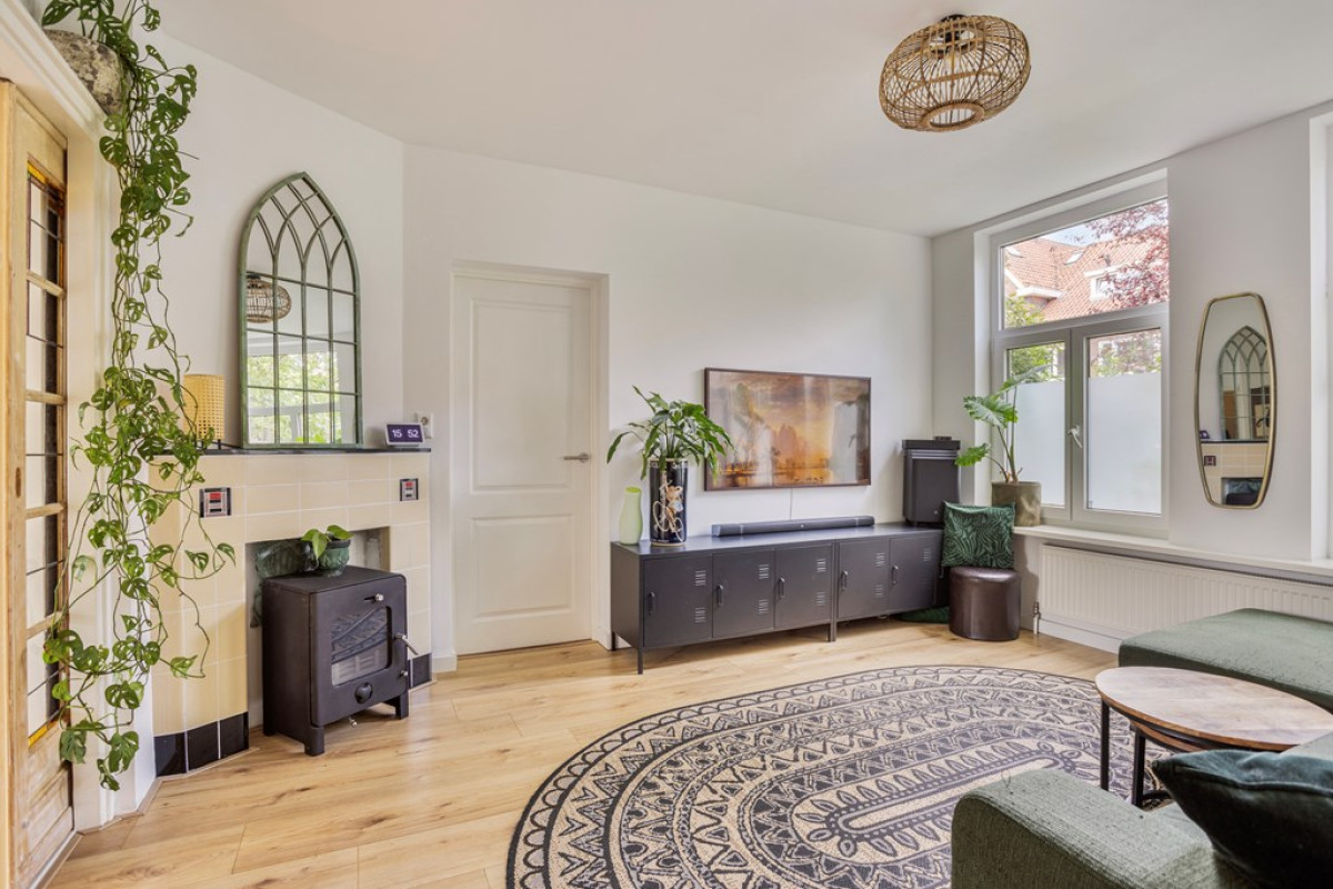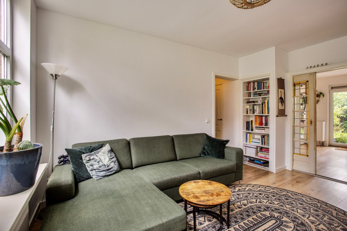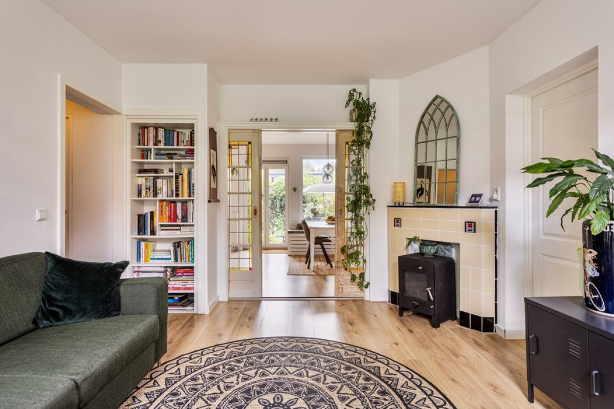 Via de ruime en groen voortuin komt de hal binnen met ruime berging en de entree naar de badkamer die voorzien is van een wastafelmeubel en bad/douche in nette staat,. De lichte woonkamer heeft een mooie houten parket vloer. Deze ruimte is ensuite, heeft nog de authentieke deuren van glas en lood en een mogelijkheid voor een houtkachel. Een ruime slaapkamer zit aangrenzend bij de woonkamer met veel lichtinval. Er is een moderne keuken in hoekopstelling geplaatst voorzien van een houten keukenblad, inductie kookplaat, vaatwasser, combi oven en koelvries combinatie. Zowel de keuken en de woonkamer hebben een deur naar de tuin met overkapping.