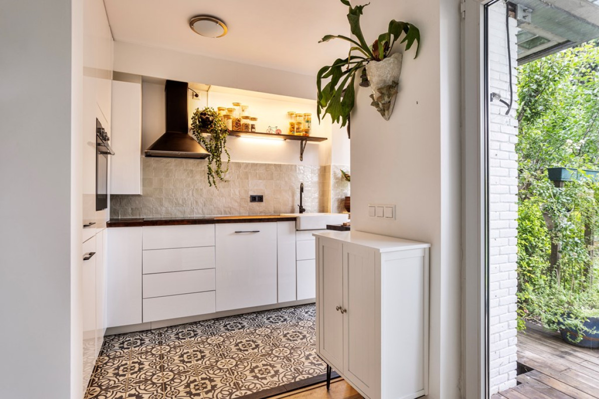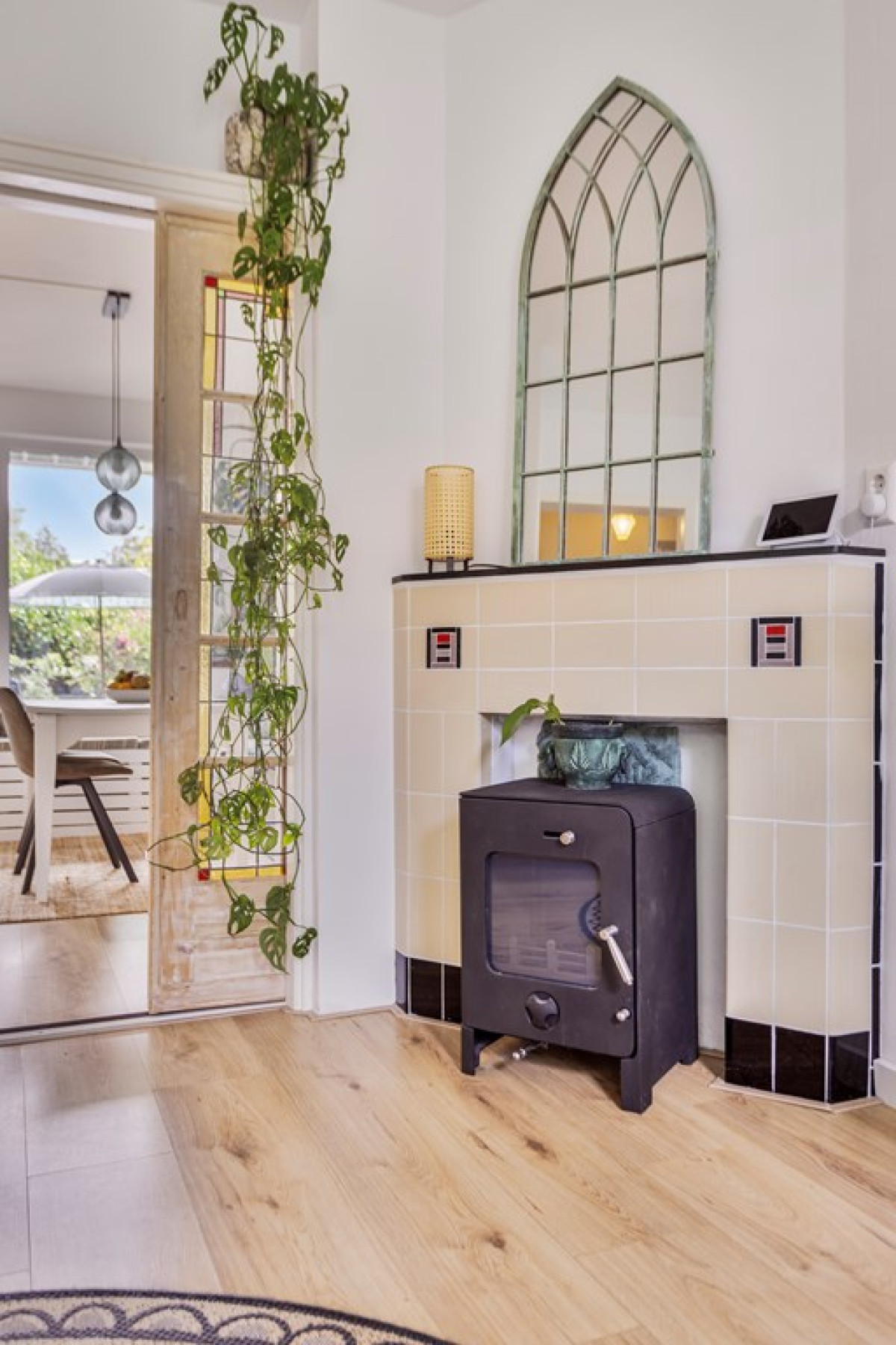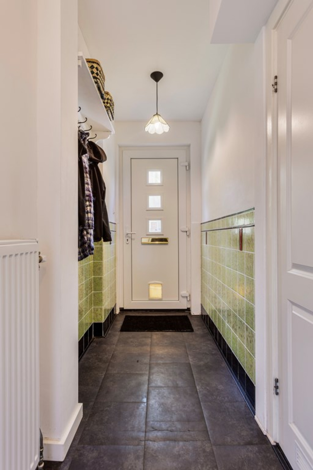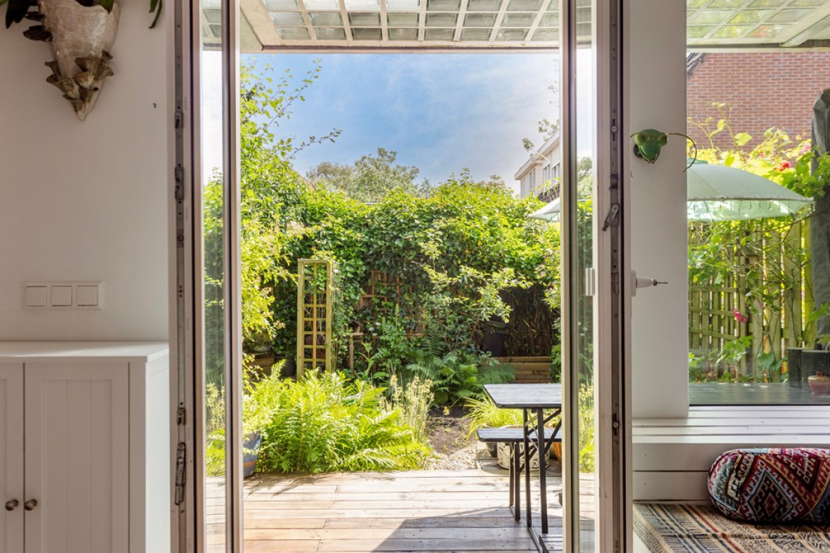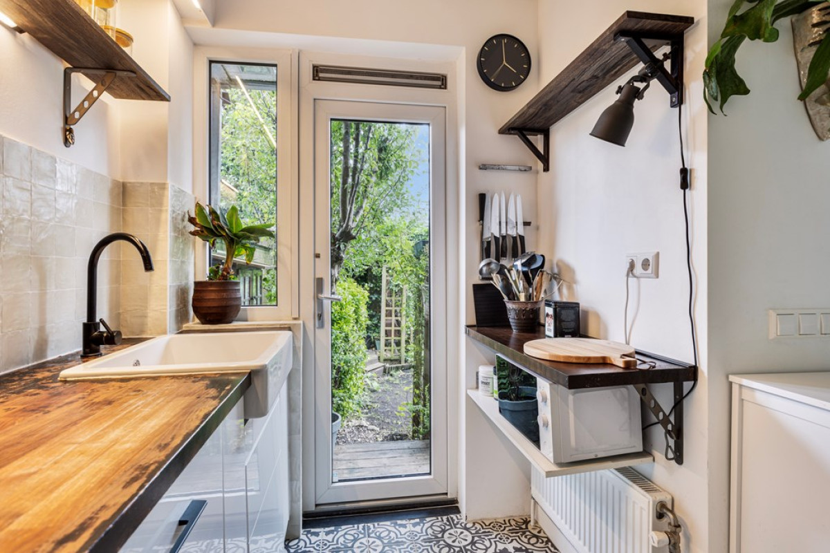 Via de ruime en groen voortuin komt de hal binnen met ruime berging en de entree naar de badkamer die voorzien is van een wastafelmeubel en bad/douche in nette staat,. De lichte woonkamer heeft een mooie houten parket vloer. Deze ruimte is ensuite, heeft nog de authentieke deuren van glas en lood en een mogelijkheid voor een houtkachel. Een ruime slaapkamer zit aangrenzend bij de woonkamer met veel lichtinval. Er is een moderne keuken in hoekopstelling geplaatst voorzien van een houten keukenblad, inductie kookplaat, vaatwasser, combi oven en koelvries combinatie. Zowel de keuken en de woonkamer hebben een deur naar de tuin met overkapping.