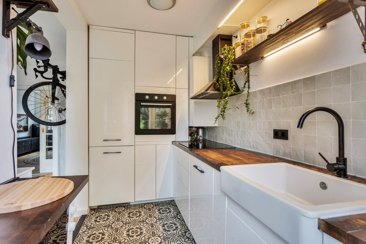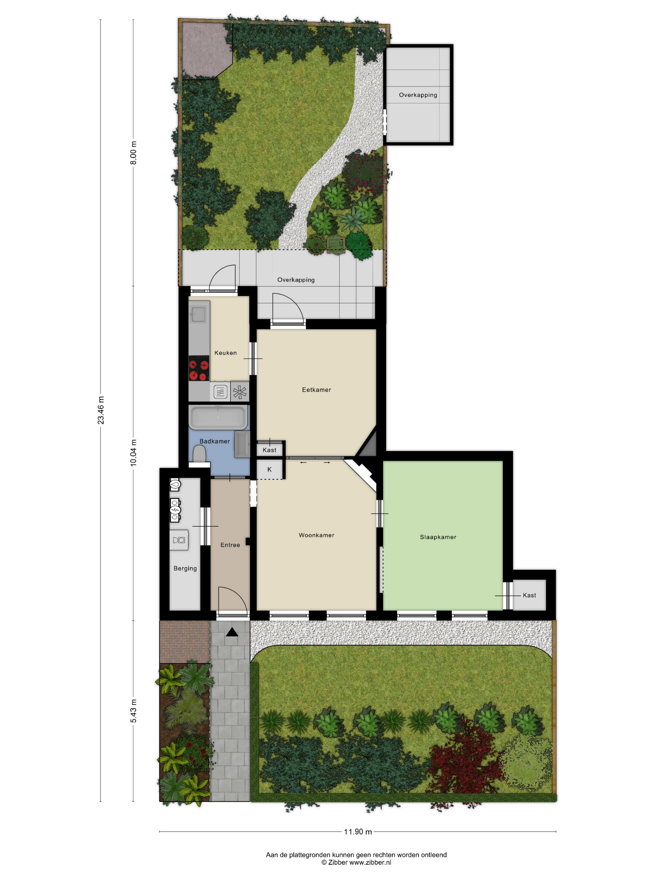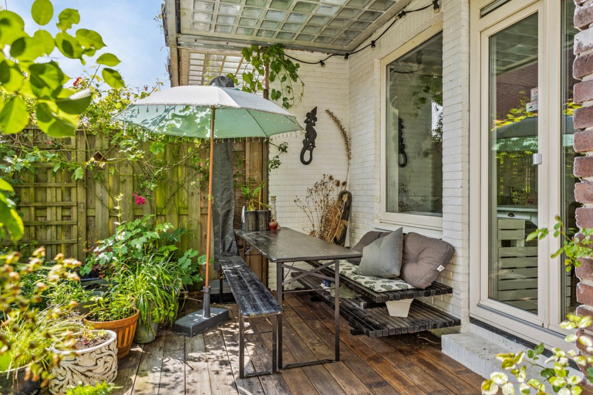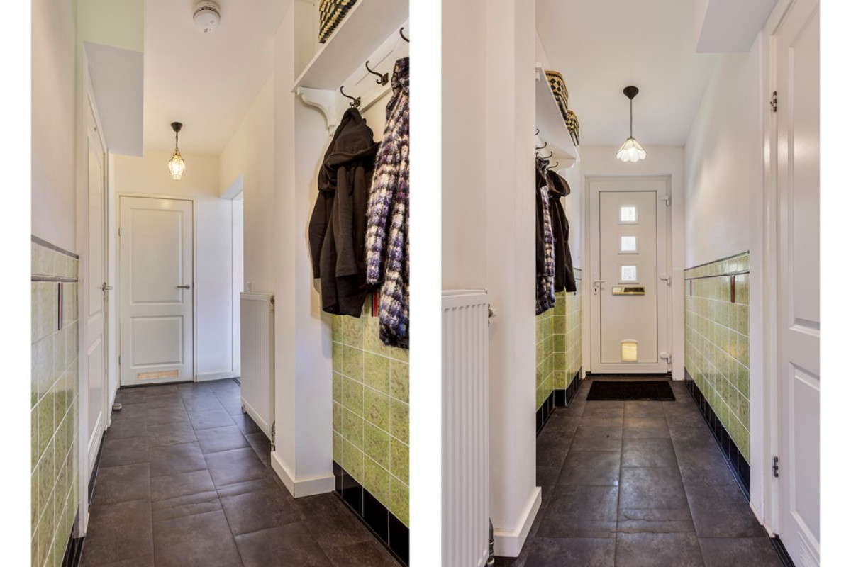Via de ruime en groen voortuin komt de hal binnen met ruime berging en de entree naar de badkamer die voorzien is van een wastafelmeubel en bad/douche in nette staat,. De lichte woonkamer heeft een mooie houten parket vloer. Deze ruimte is ensuite, heeft nog de authentieke deuren van glas en lood en een mogelijkheid voor een houtkachel. Een ruime slaapkamer zit aangrenzend bij de woonkamer met veel lichtinval. Er is een moderne keuken in hoekopstelling geplaatst voorzien van een houten keukenblad, inductie kookplaat, vaatwasser, combi oven en koelvries combinatie. Zowel de keuken en de woonkamer hebben een deur naar de tuin met overkapping.