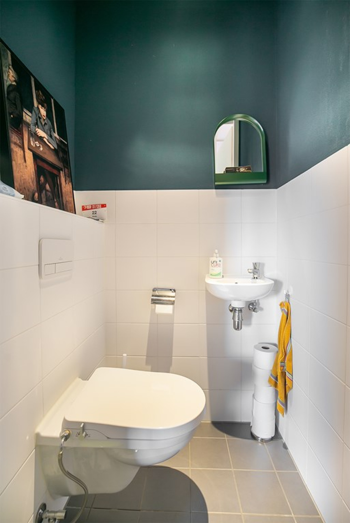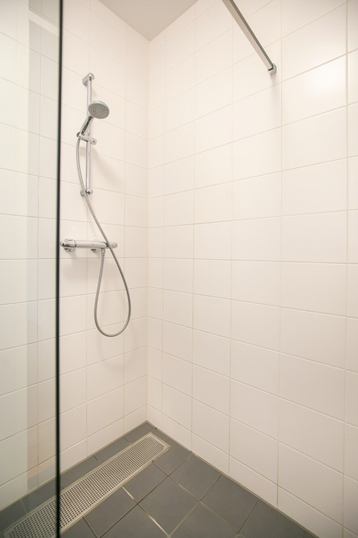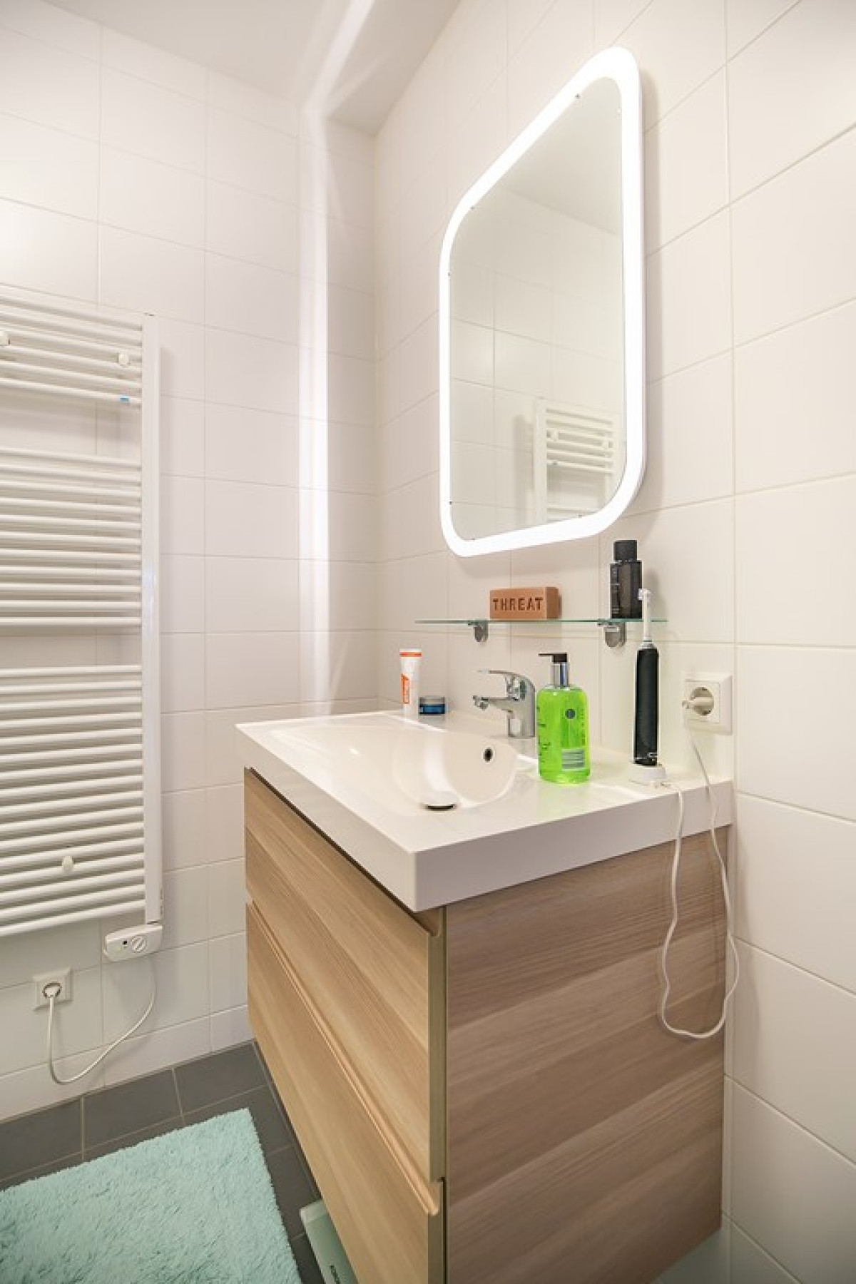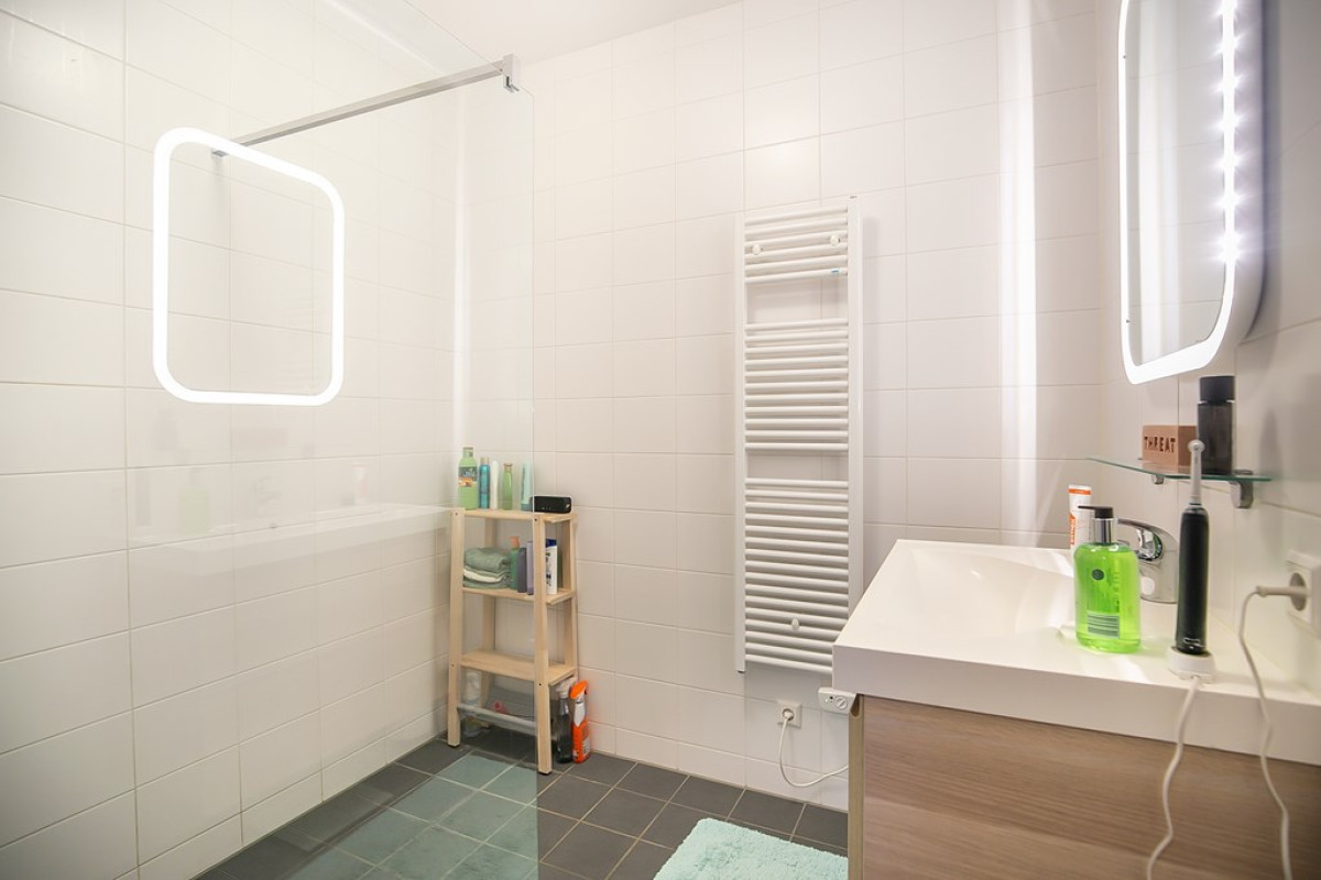 In de badkamer, welke functionaliteit met stijl combineert, vind je donkere vloertegels, witte wandtegels, een radiator, wastafelmeubel en een inloopdouche.