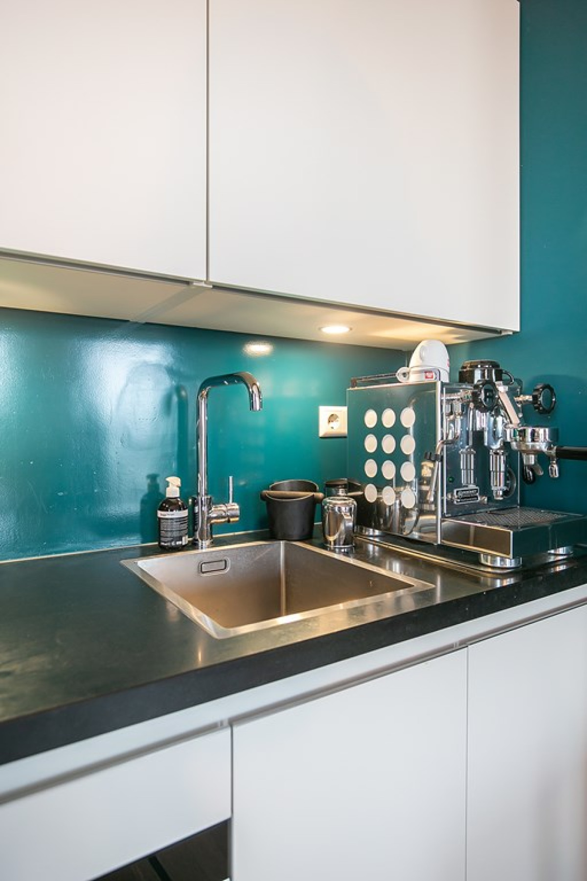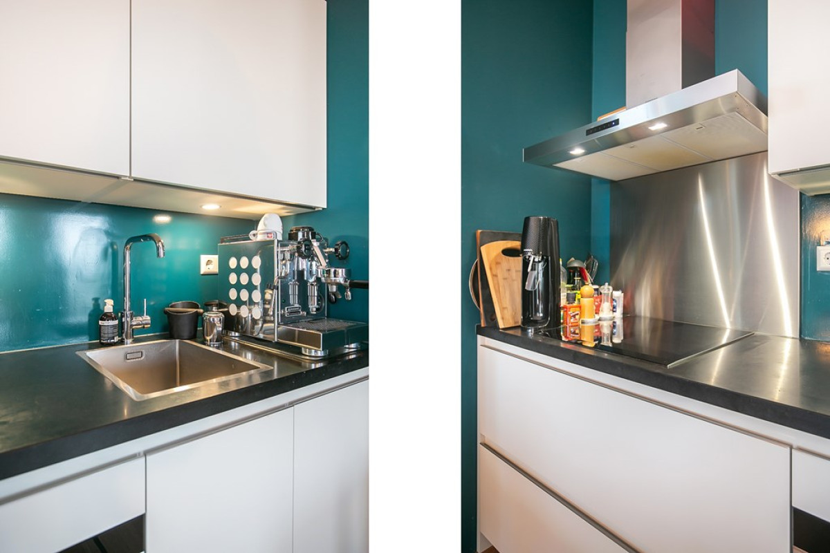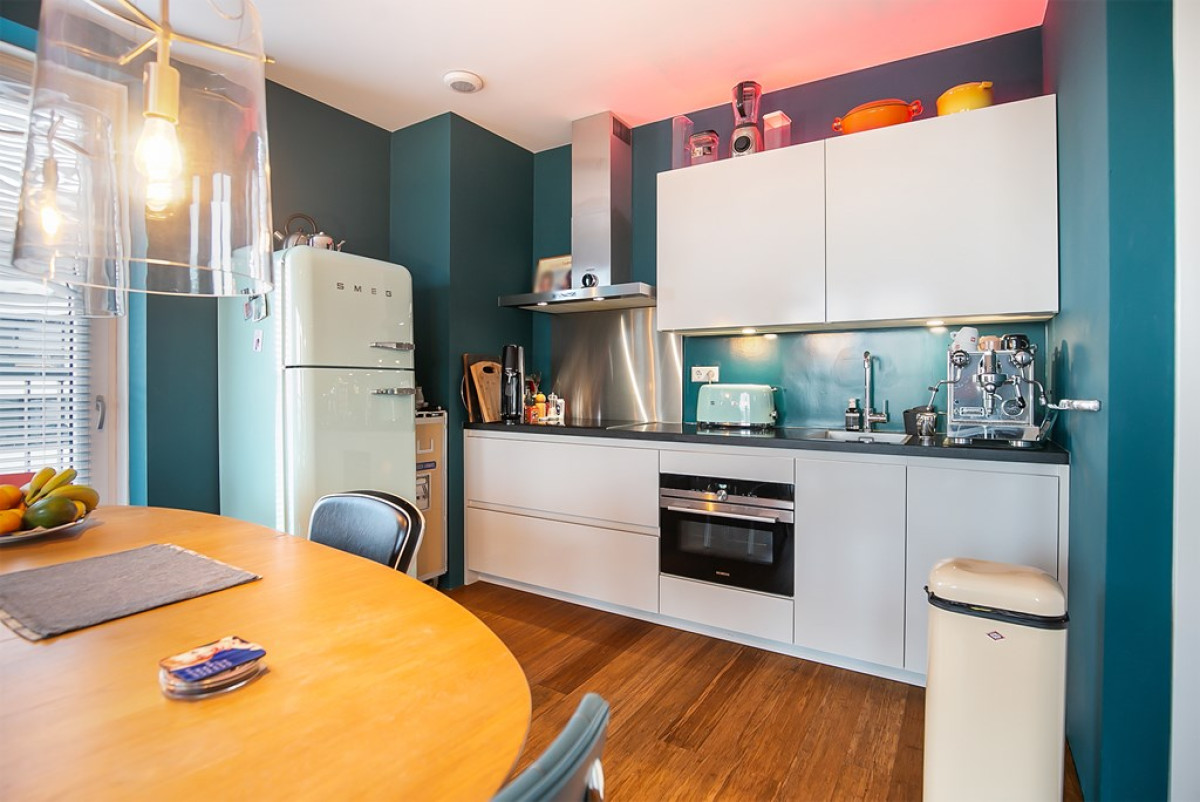 De keuken, met witte greeploze kasten en een donker werkblad, is uitgerust met een inductiekookplaat, afzuigkap, inbouwoven (Siemens) en een retro koel-/vriescombinatie (SMEG).