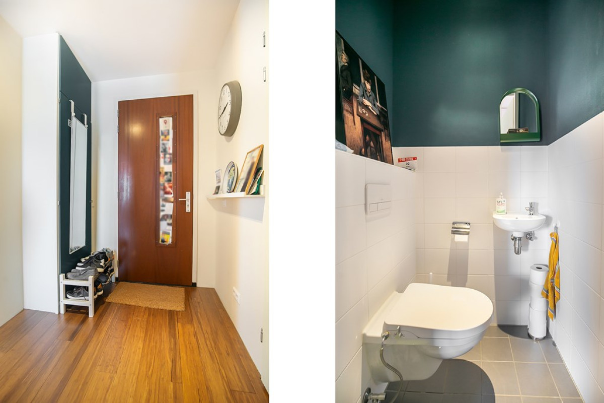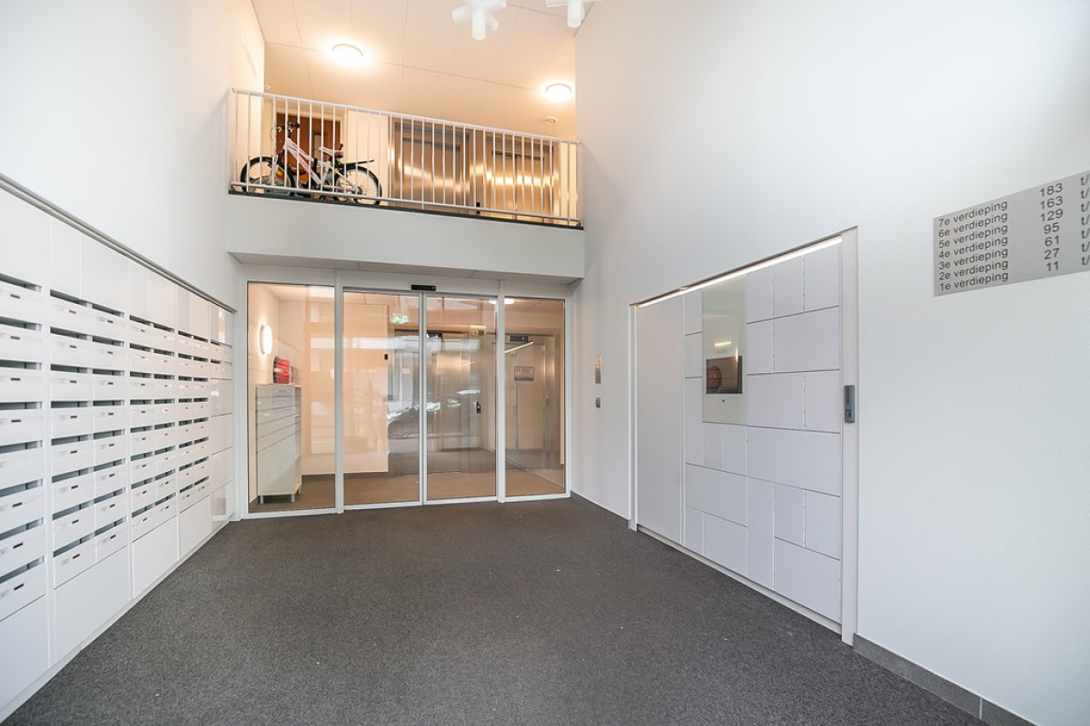 Betreed het appartement via de centrale hal, waar een vaste trap of lift je naar jouw verdieping brengt. De entreehal leidt naar twee slaapkamers, een separaat toilet, een badkamer en een woonkamer.