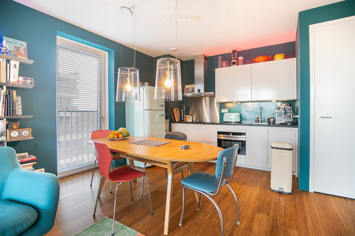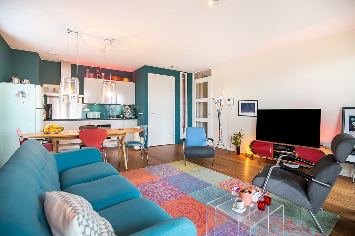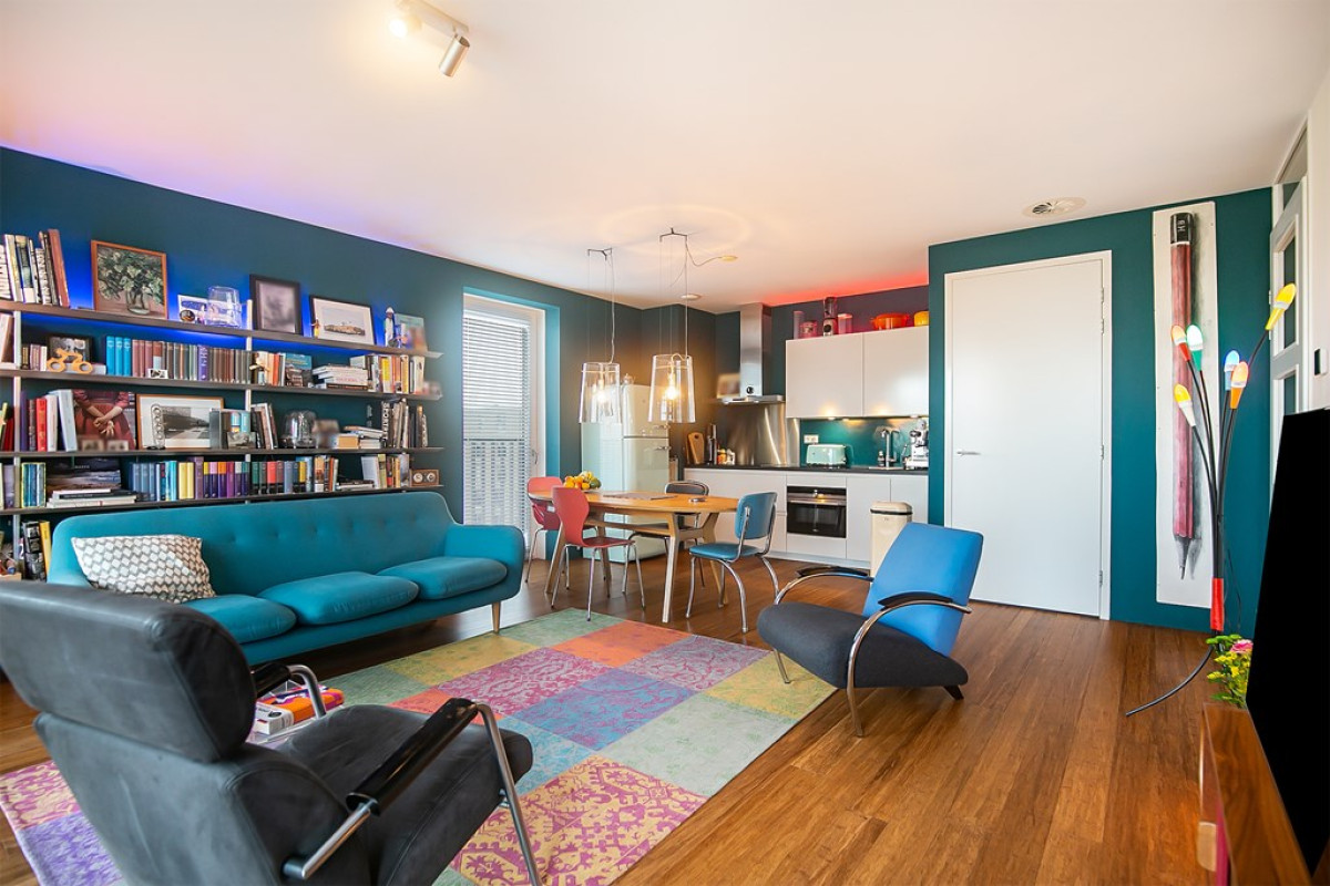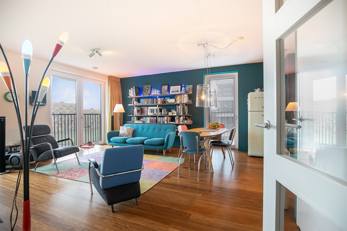Deze woonkamer, met warme bamboe vloer, is de ideale plek voor ontspanning en dineren. Dankzij de grote raampartijen badend in natuurlijk licht, voelt de ruimte open en luchtig aan. Vanuit hier stap je zo het balkon op en geniet je van het uitzicht, terwijl de open keuken de ruimte compleet maakt.