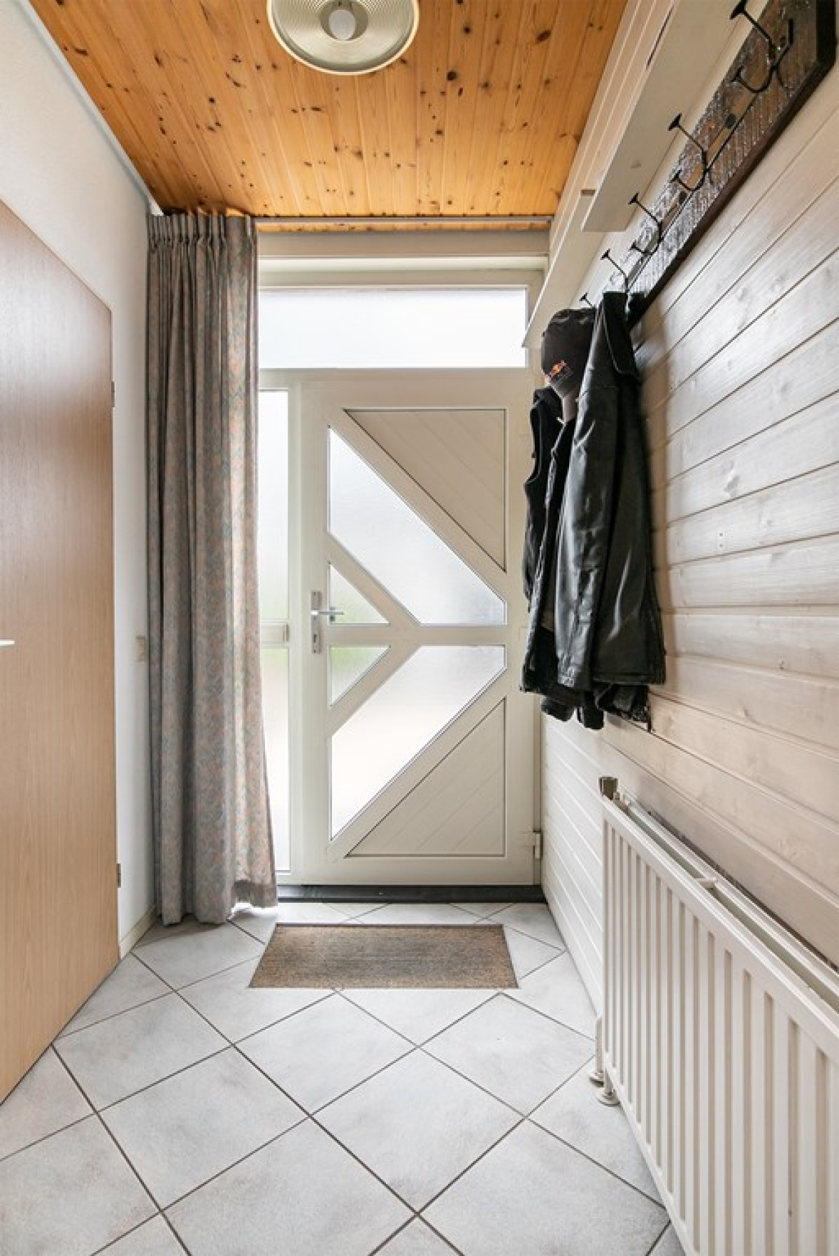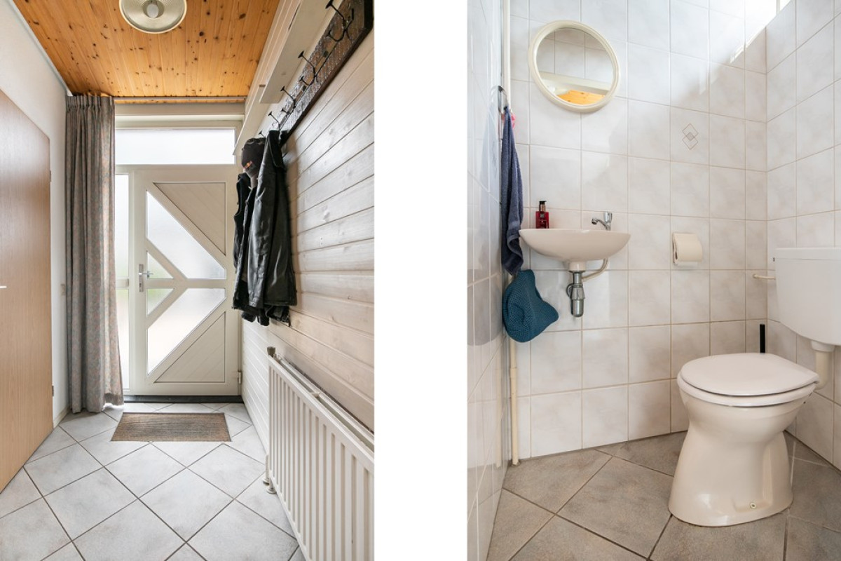 Via de voortuin, waarin het mogelijk is om je auto te parkeren, kom je binnen in de hal. Hier vind je de toiletruimte en meterkast. In de hal en ligt een tegelvloer die doorloopt in het toilet.