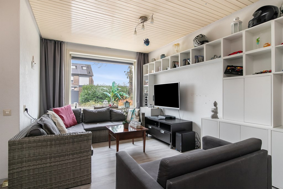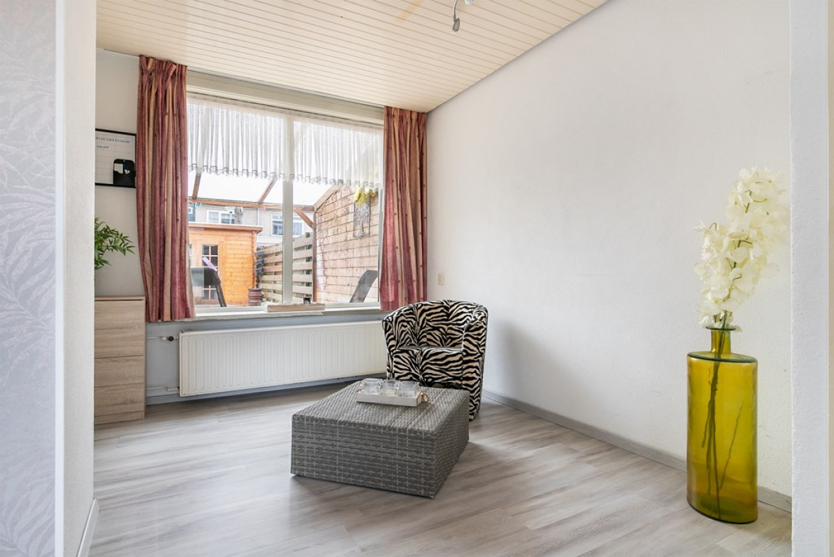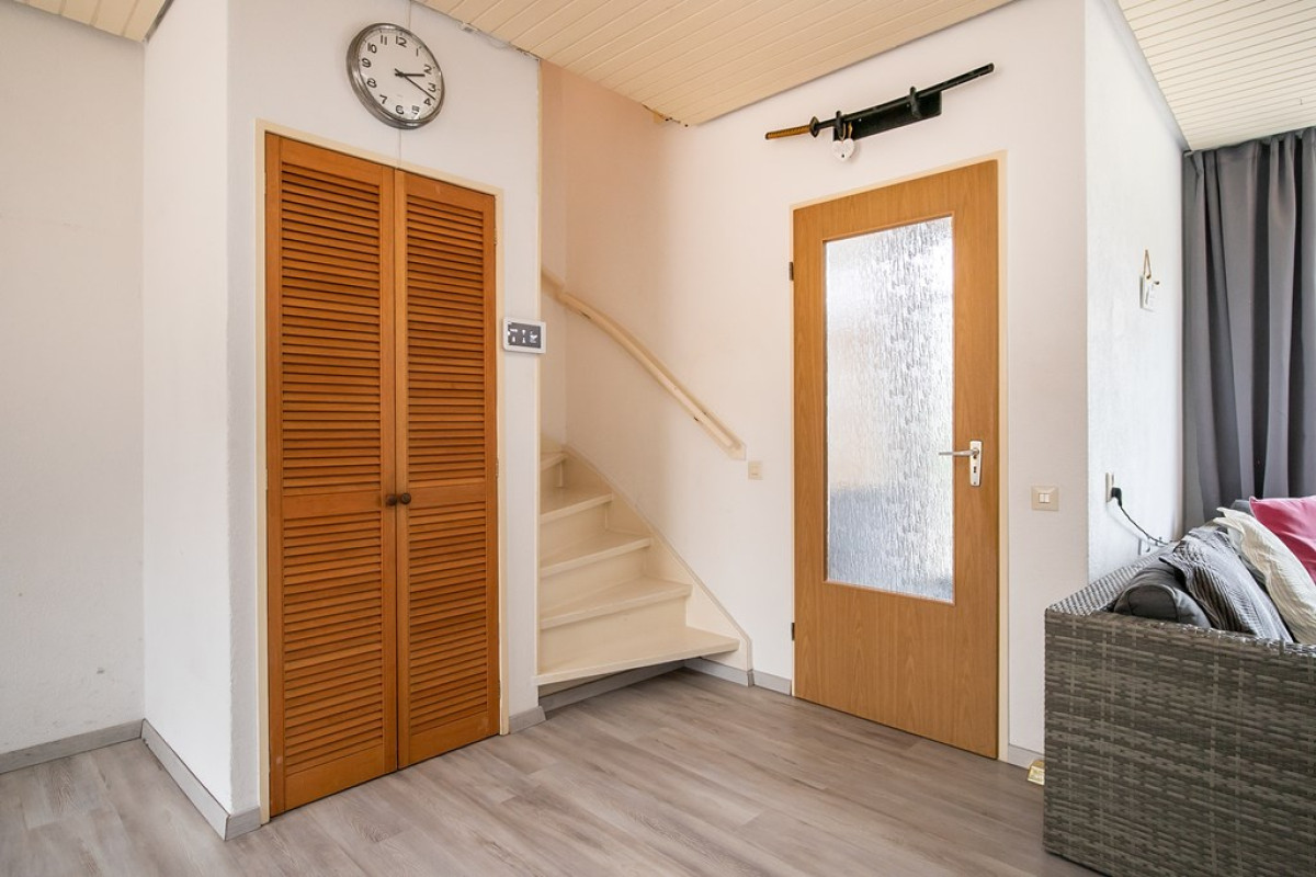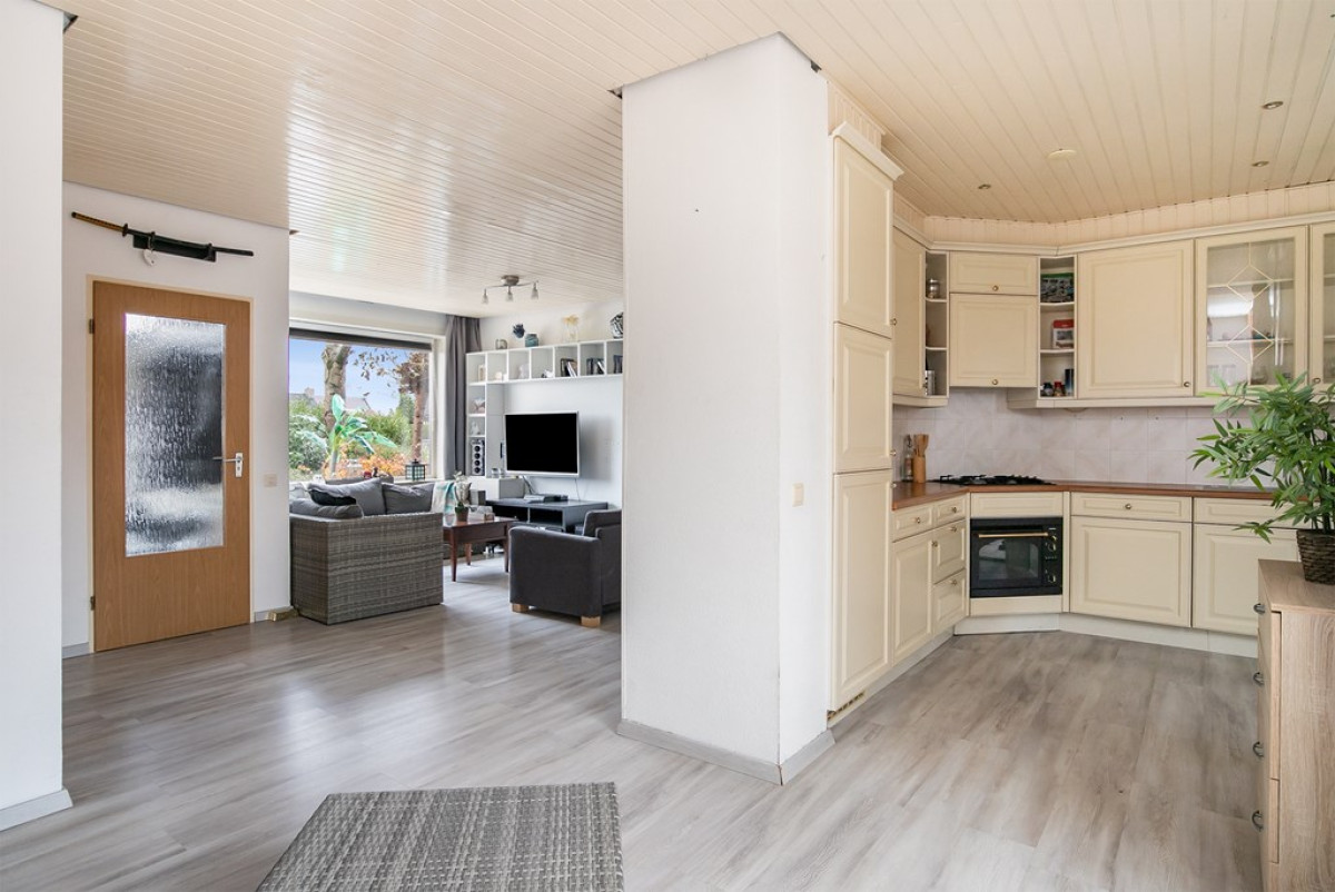 Vanuit de hal stap je de ruime en lichte Z vormige woonkamer binnen, die in open verbinding met de keuken staat. Zowel aan de voor- als achterkant is een grote raampartij aanwezig en de handige trapkast met Louvredeuren biedt veel opbergruimte. Op de vloer ligt een laminaatvloer die in de keuken doorloopt.