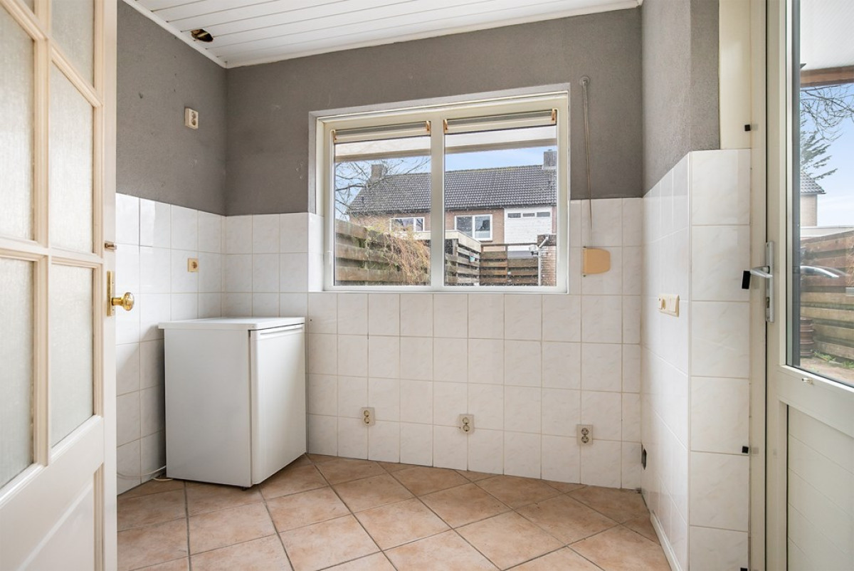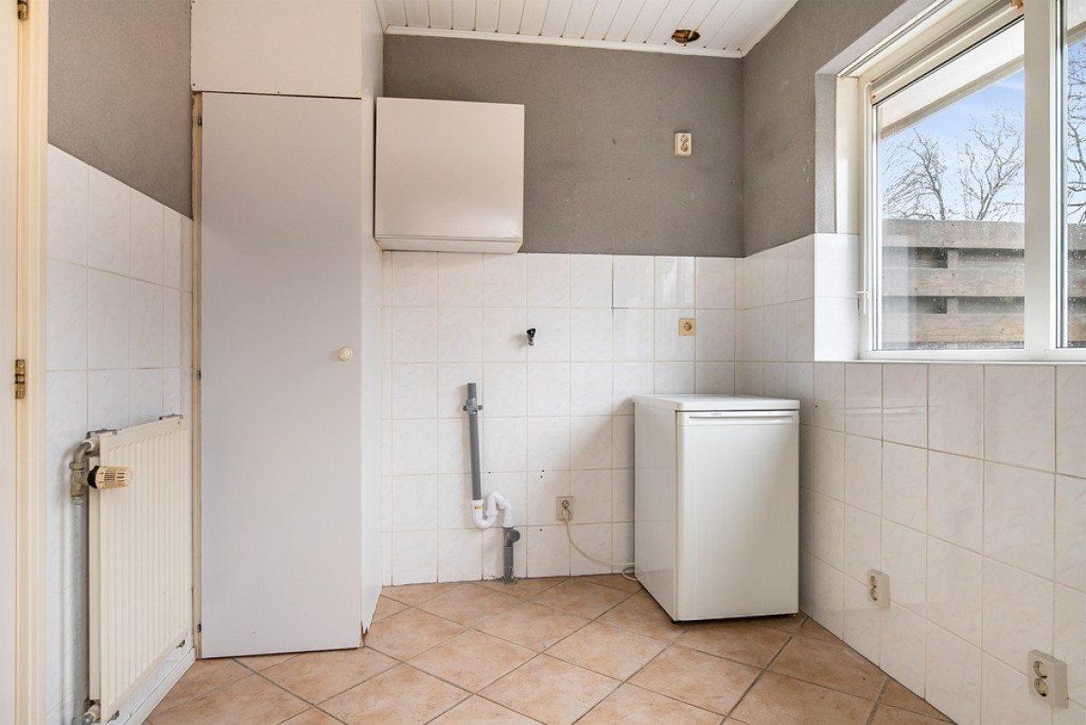 Deze ruimte is betegeld en naast de wasmachine, blijft er nog voldoende ruimte over voor een diepvries en extra koelkast. Vanuit de bijkeuken is de achtertuin te bereiken.