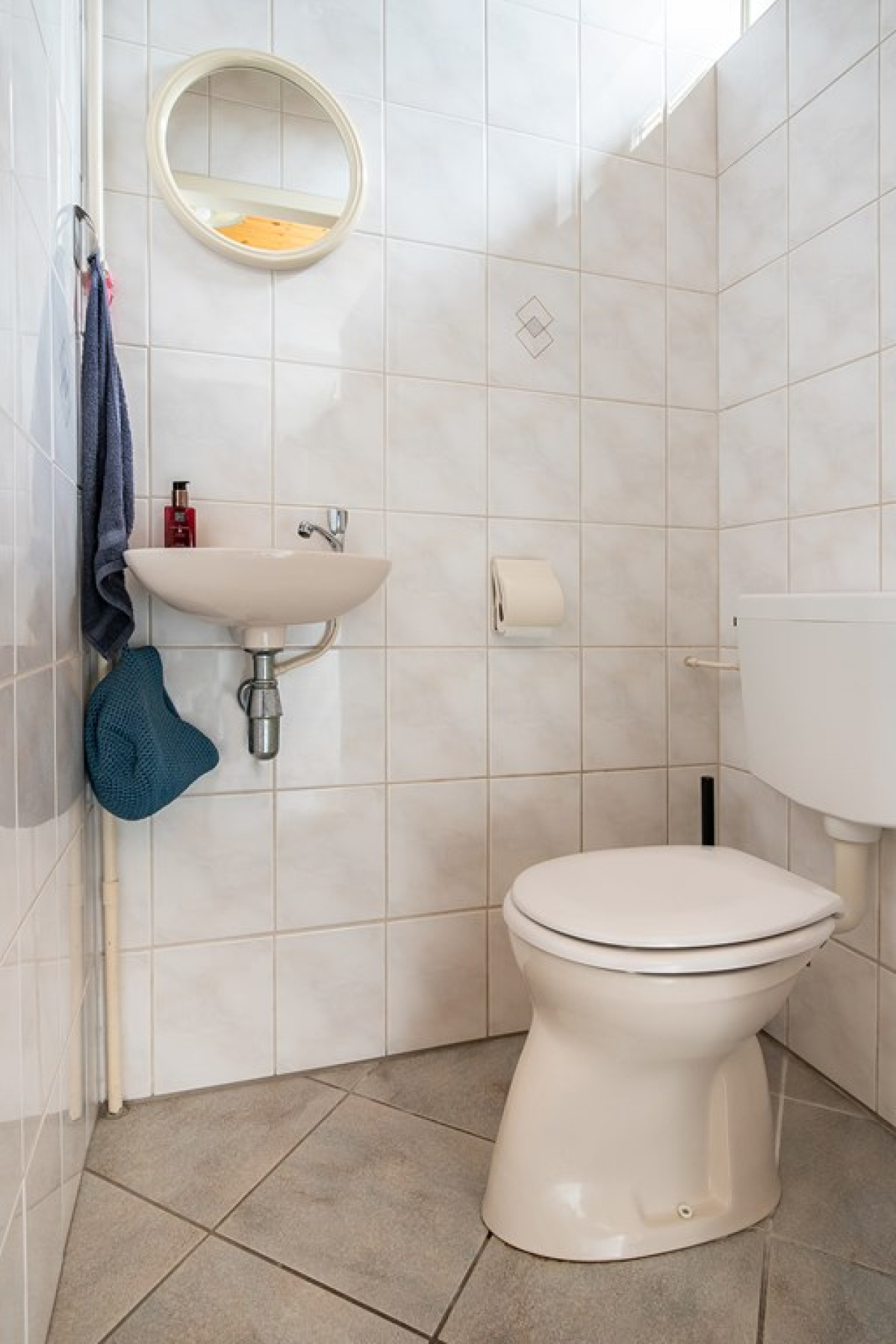 Het toilet is volledig betegeld en is voorzien van een fonteintje.