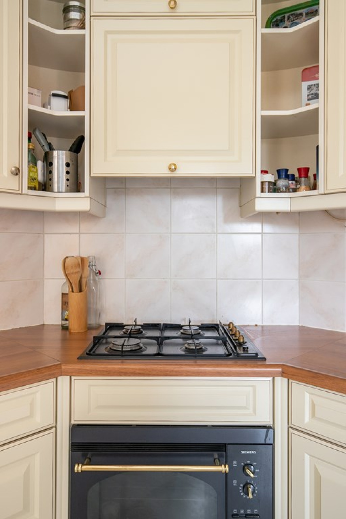 De keuken is in een L vorm opgesteld en voorzien van een koelkast, vaatwasser combi oven, gasfornuis, close-in boiler en ingebouwde afzuiginstallatie.