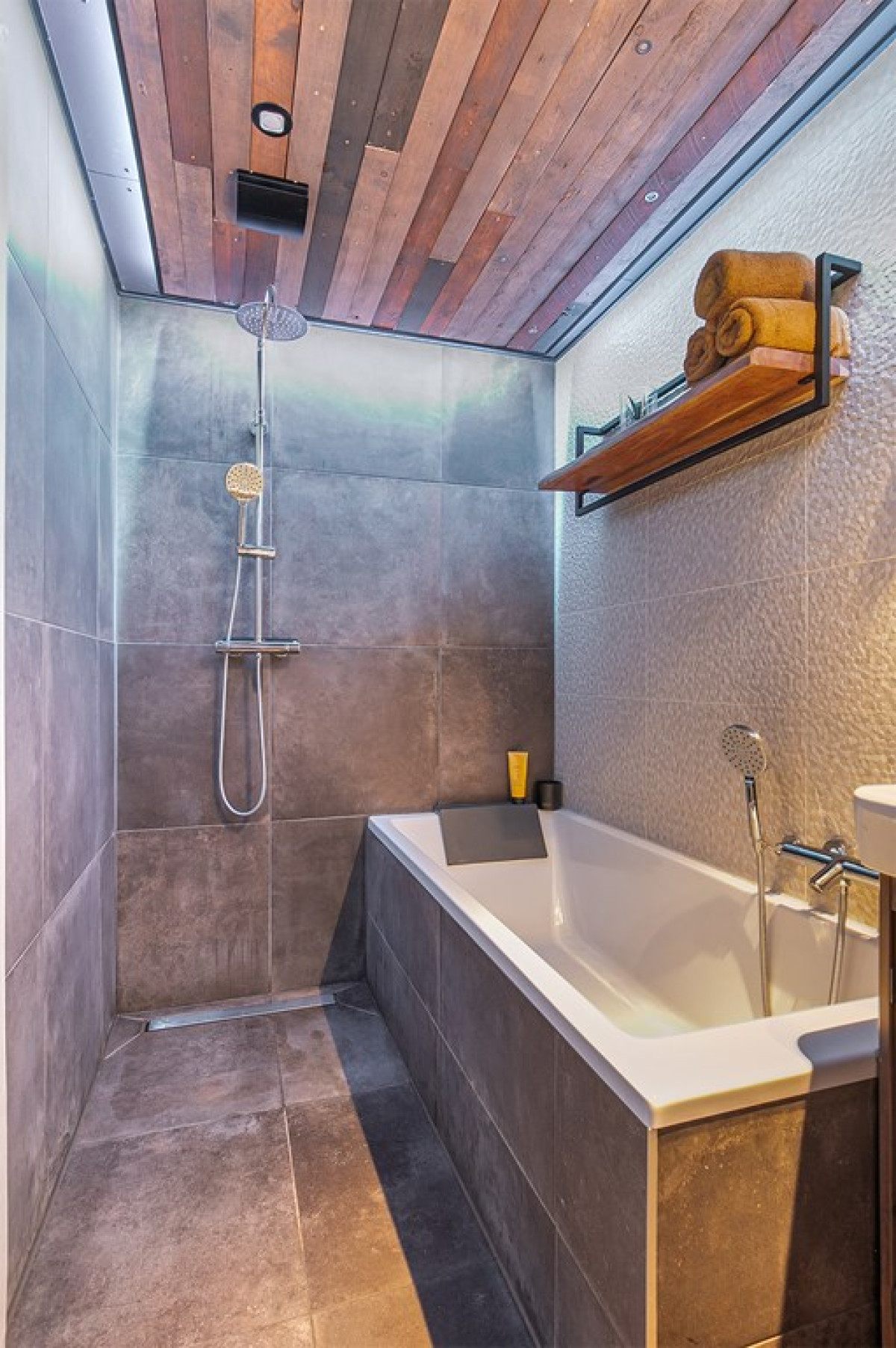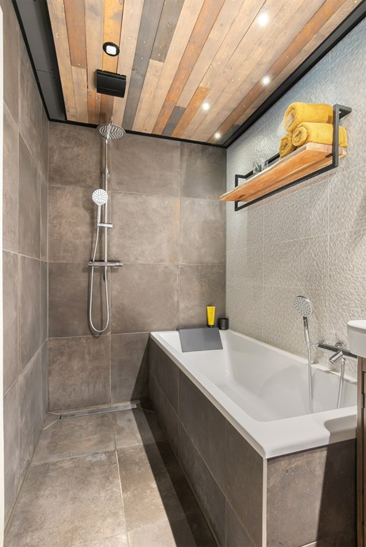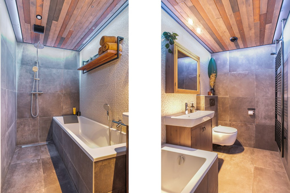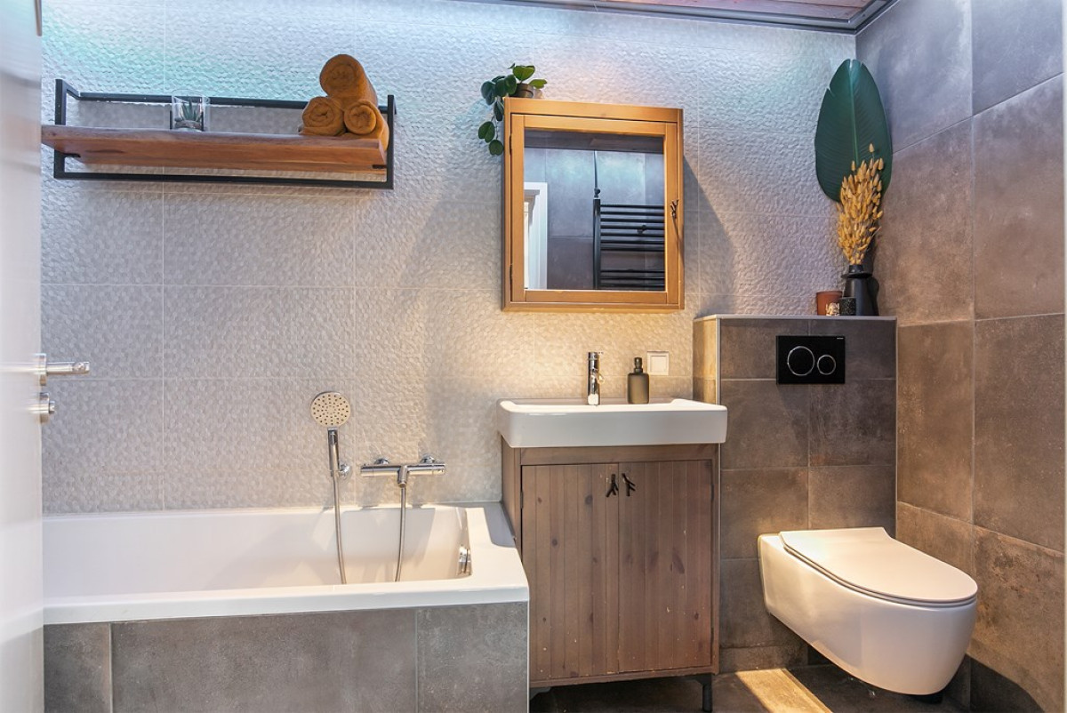 De badkamer is niet alleen stijlvol, maar ook heel praktisch ingedeeld met een ligbad, aparte inloopdouche, wastafelmeubel en toilet.