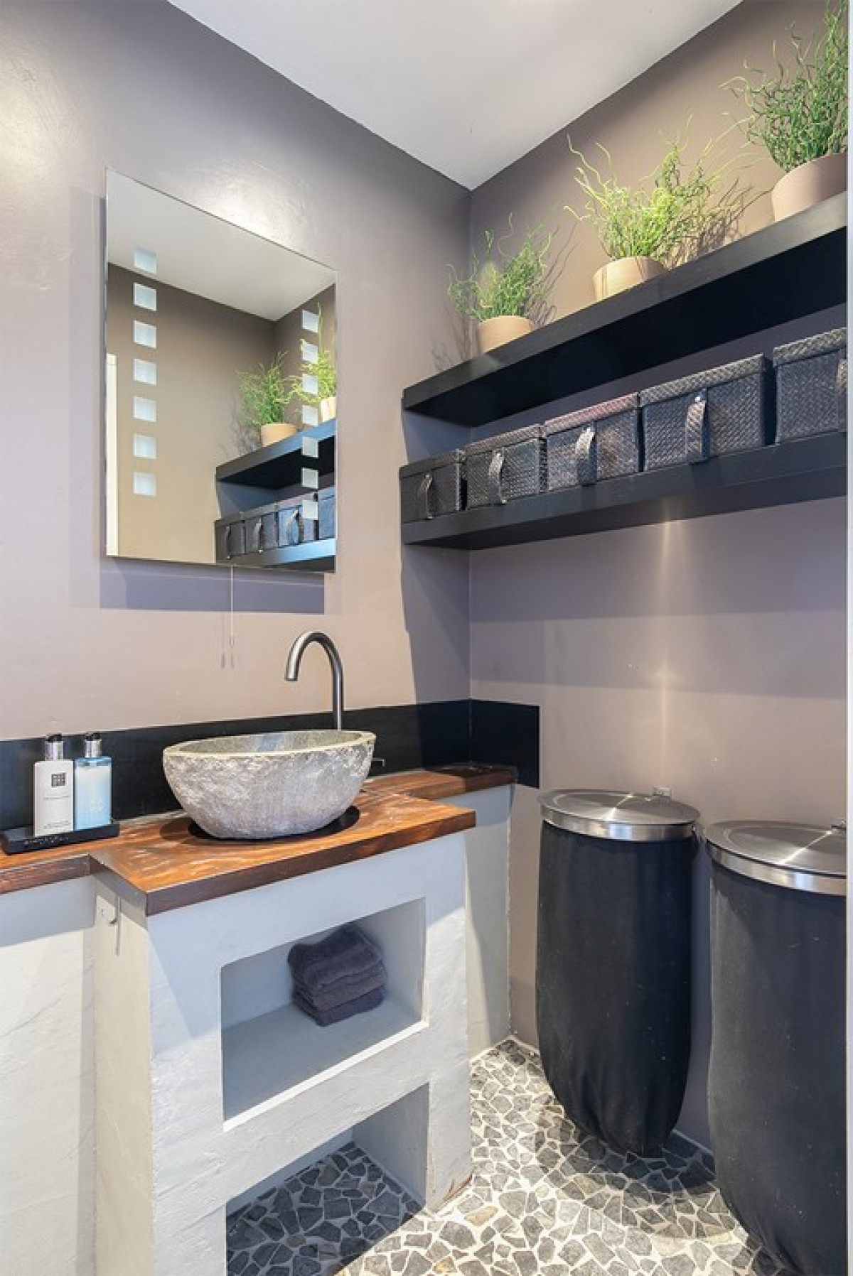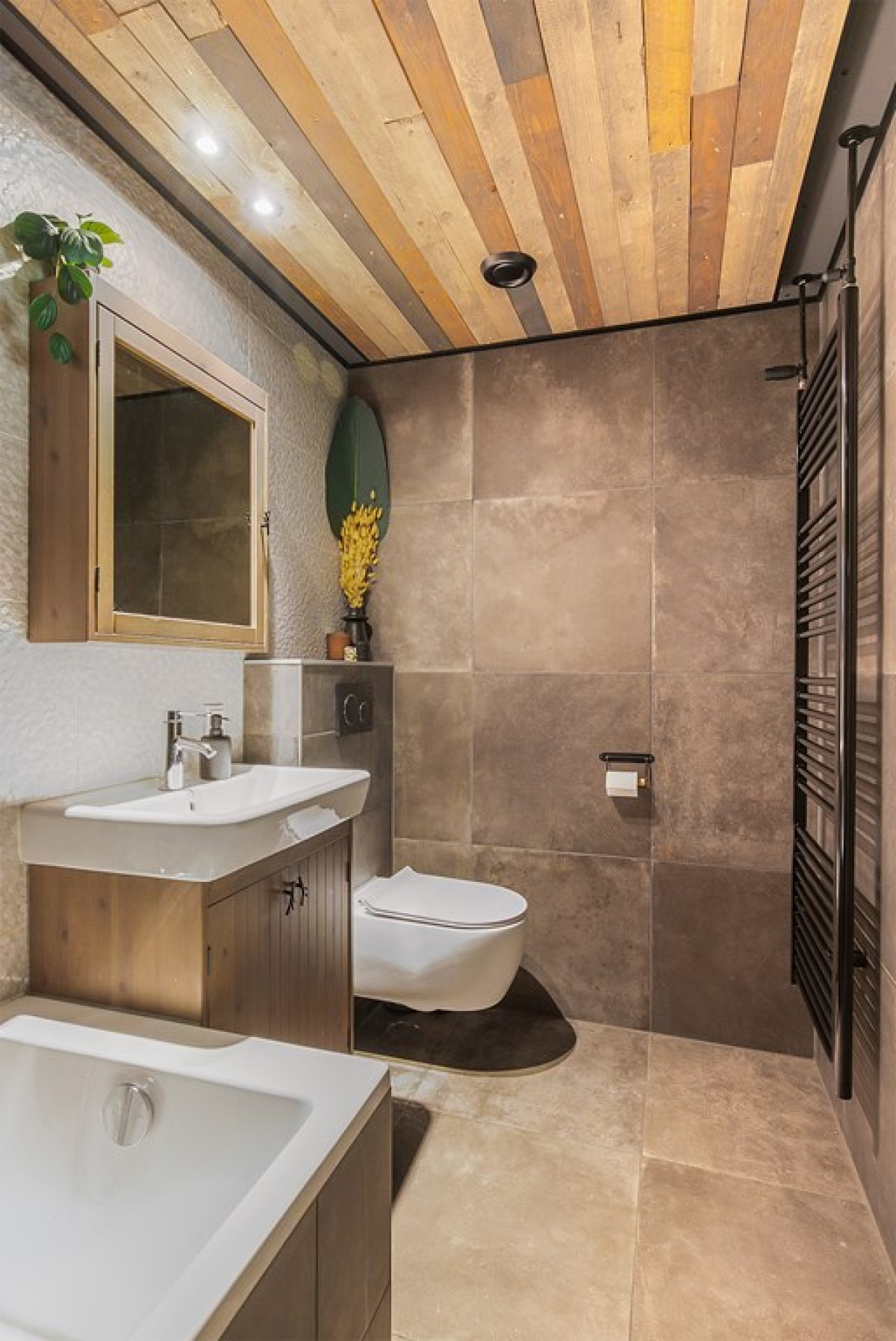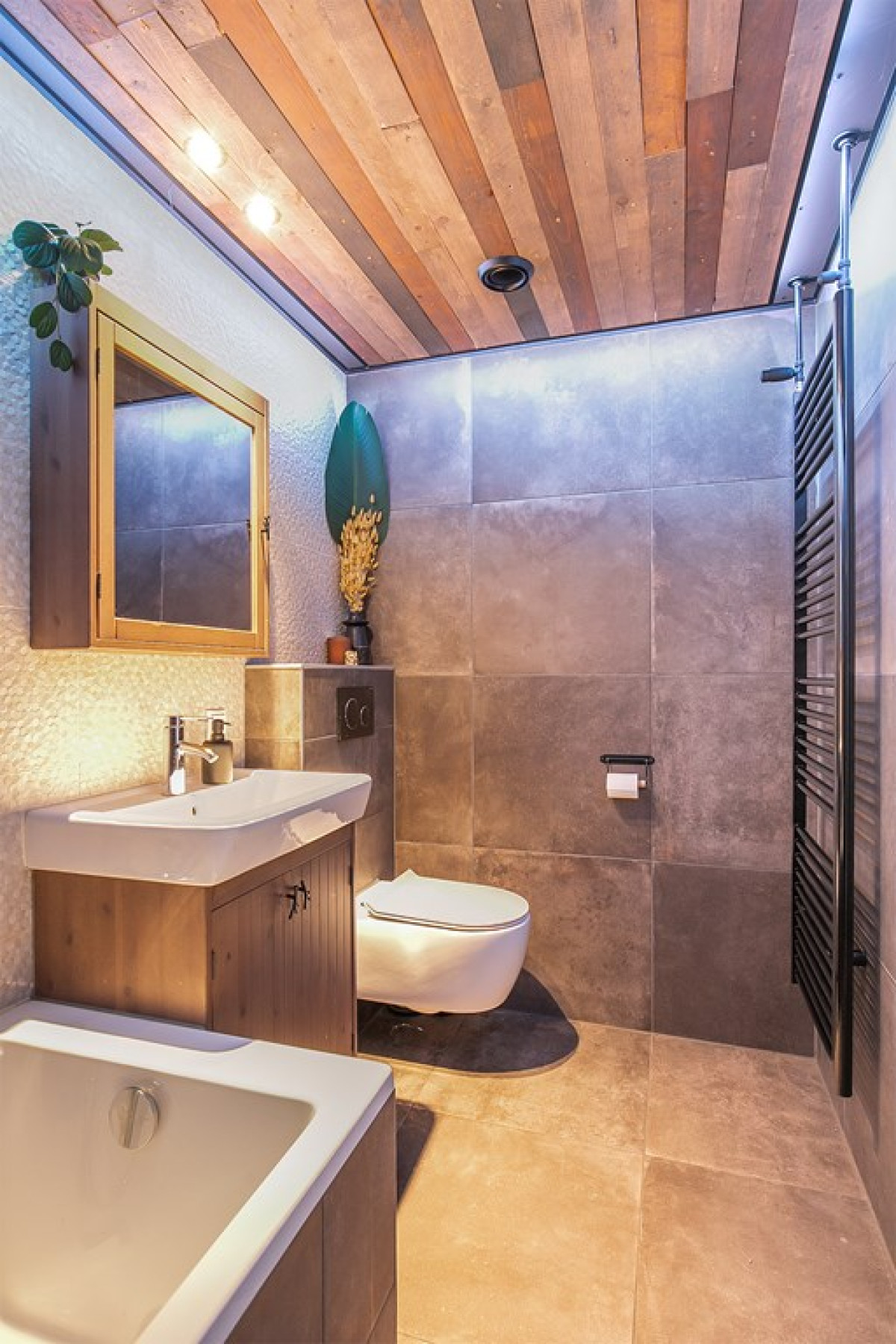 De badkamer is niet alleen stijlvol, maar ook heel praktisch ingedeeld met een ligbad, aparte inloopdouche, wastafelmeubel en toilet.