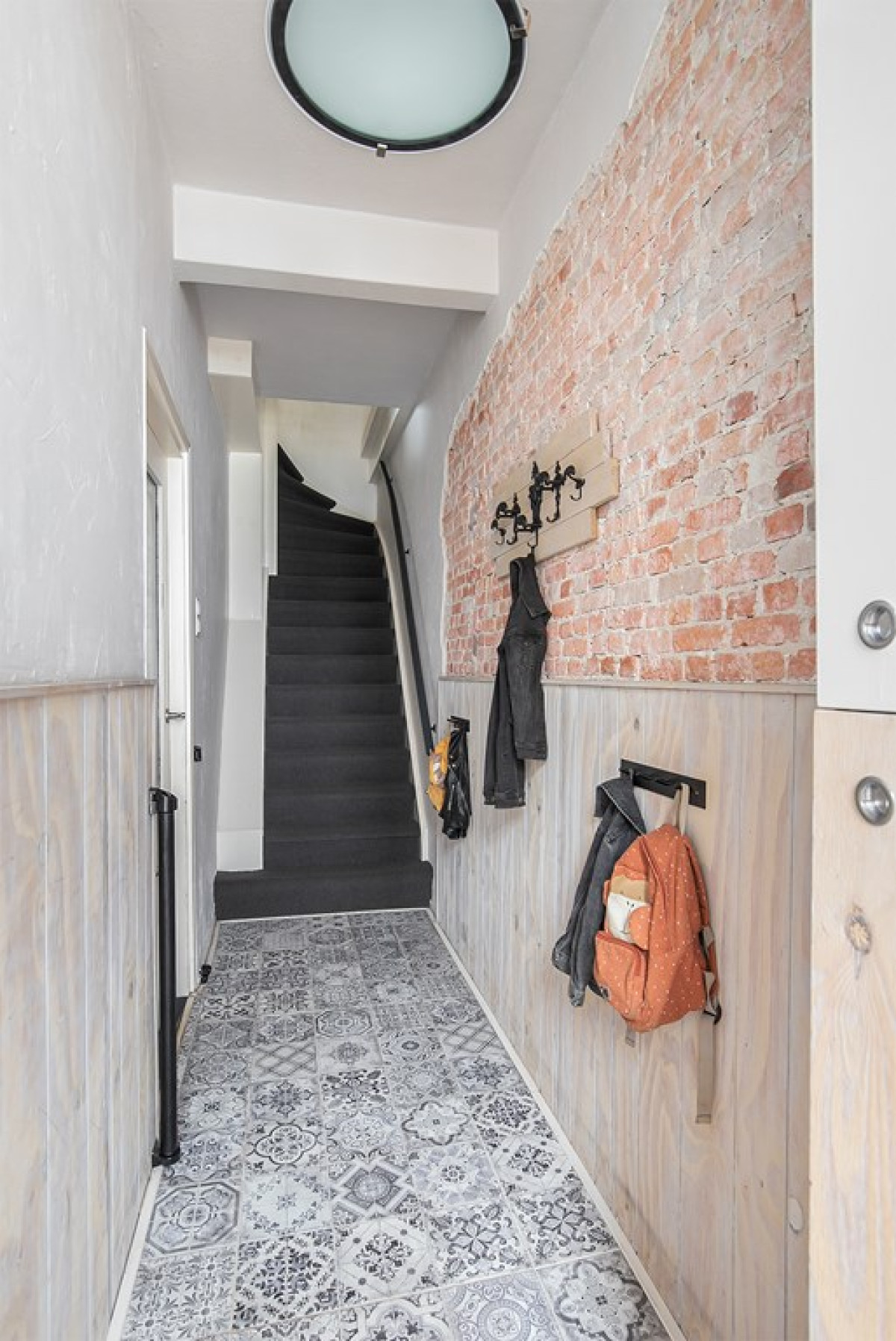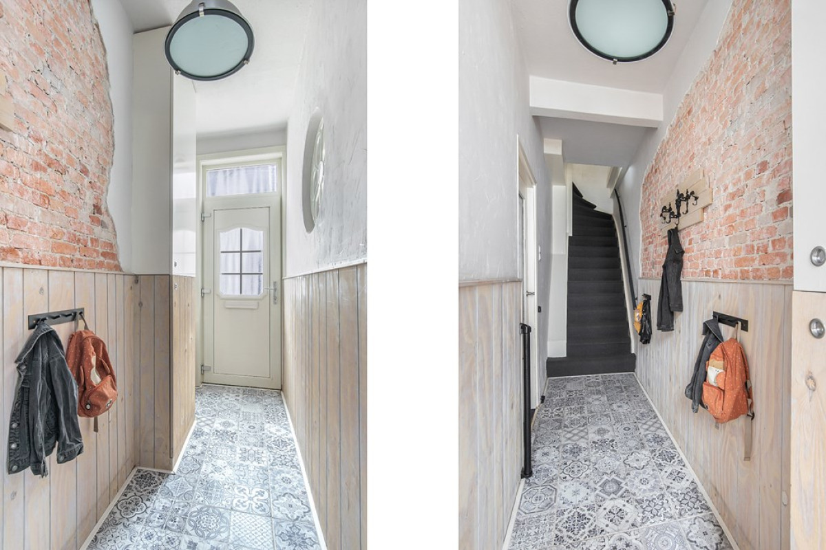 De ontvangsthal zet qua afwerking direct de toon voor de rest van het huis. Overal zijn sfeervolle details aangebracht. Een speelse tegelvloer en lambrisering van hout. De authentieke stenen muur is voor een groot gedeelte zichtbaar gemaakt. En hoe leuk is het ronde raam met doorkijk naar de living! Vanuit de hal is de trap naar de eerste verdieping en de woonkamer te bereiken. De living is voorzien van een laminaat vloer en bestaat uit een zit en eetgedeelte met in het