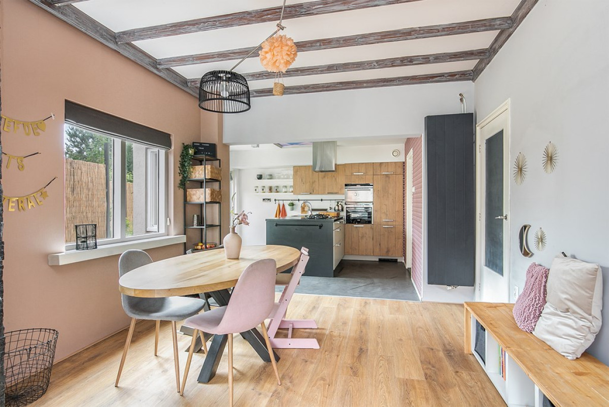 Het eetgedeelte staat in open verbinding met de keuken.