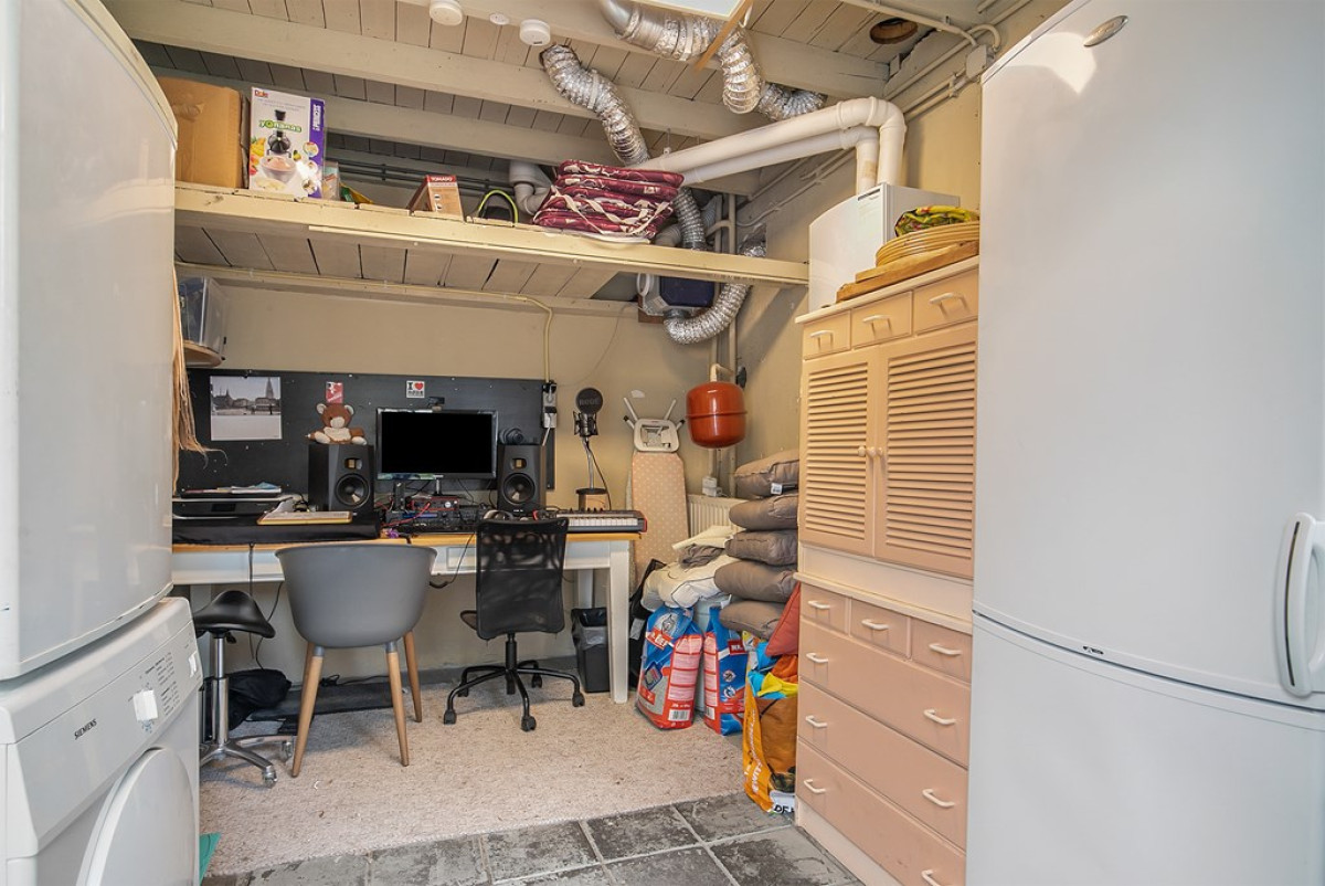Vanuit de tuin is de bijkeuken te bereiken die momenteel als wasruimte en werkkamer in gebruik is.