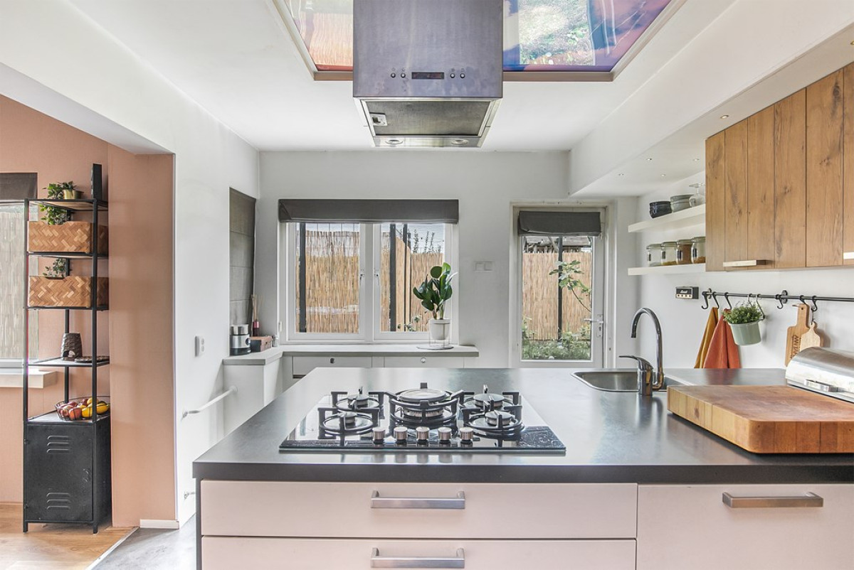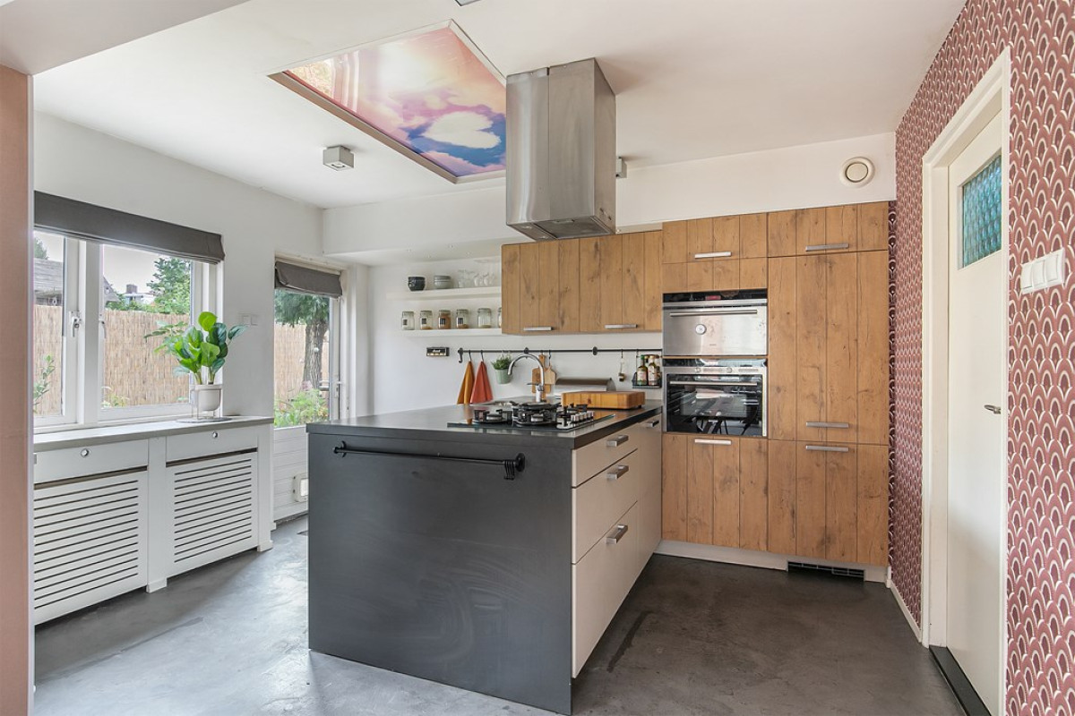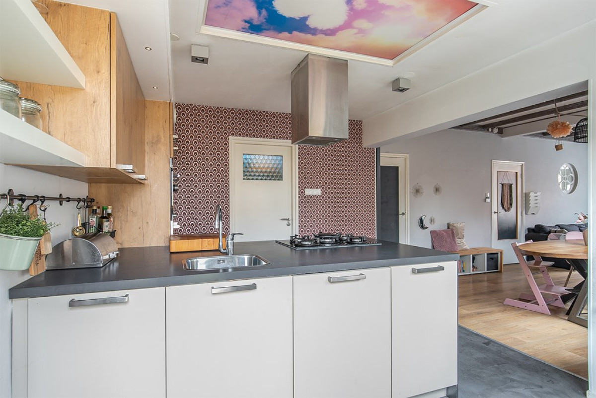 De keuken is voorzien van een gietvloer, heeft een speelse indeling en is luxe uitgerust met diverse inbouwapparatuur. Je vindt hier een stoomoven, combimagnetron, vaatwasser, koelkast, gaskookplaat, afzuigkap en close in boiler. Vanuit de keuken is de zij-en achtertuin en badkamer te bereiken.