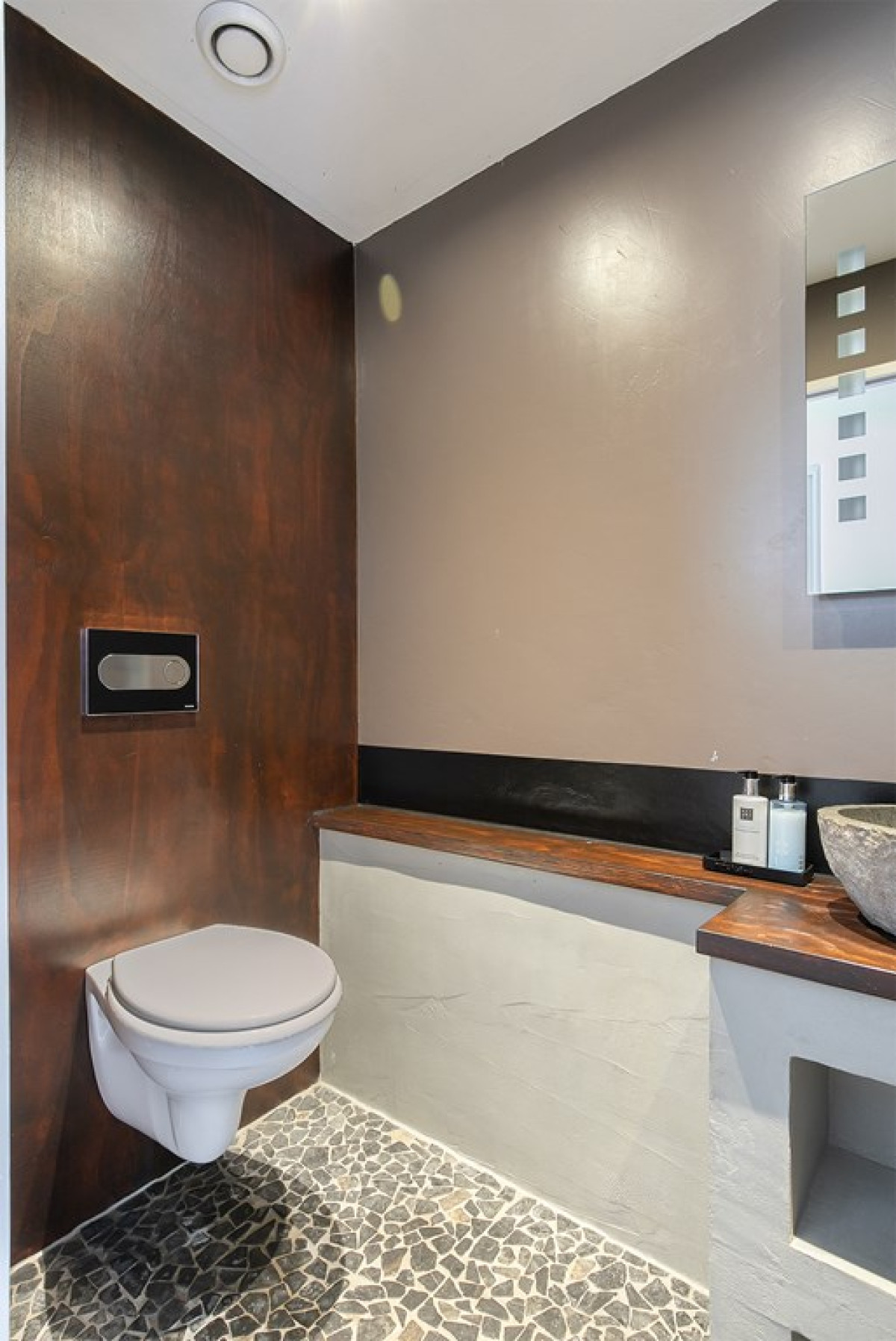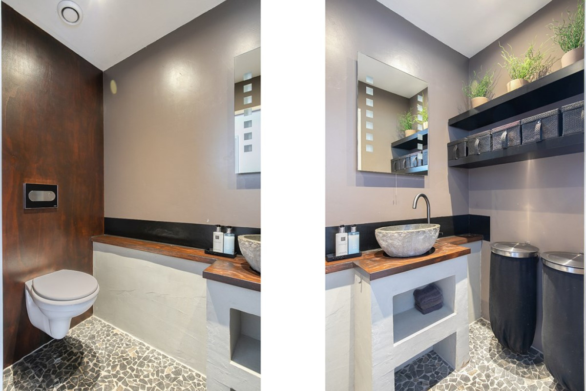 In de royale toiletruimte is naast een toilet ook een wastafelmeubel aanwezig. Er is voldoende ruimte om eventueel i.p.v. de wastafel een douche te plaatsen.