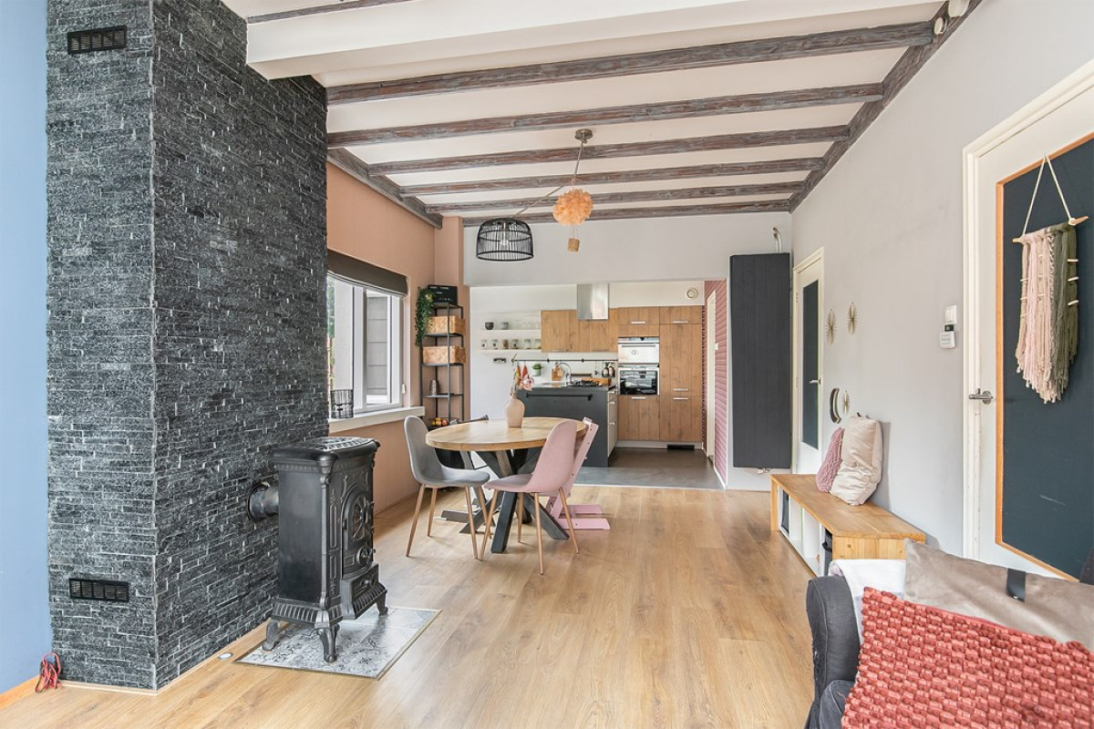 midden een mooie houtkachel die letterlijk en figuurlijk voor een warme sfeer zorgt. De stenen schouw en het houten balken plafond maken het plaatje compleet.