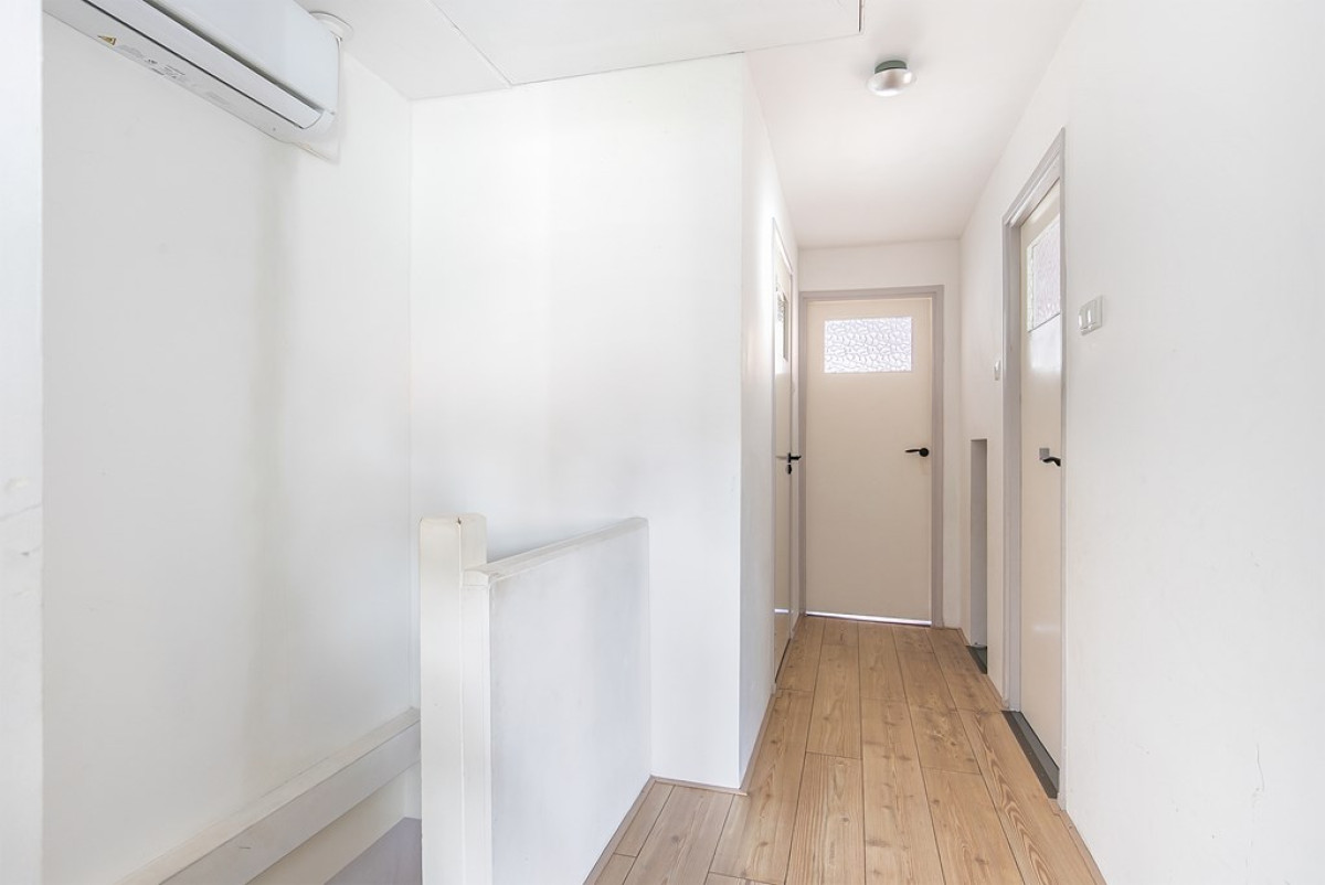 Via de vaste trap in de entree kom je uit op de overloop met laminaathouten vloer en airconditioning. Vanuit de overloop heb je toegang tot de bergzolder, toiletruimte en slaapkamers. Deze verdieping is in 2018 gerenoveerd en er is een opbouw geplaatst.