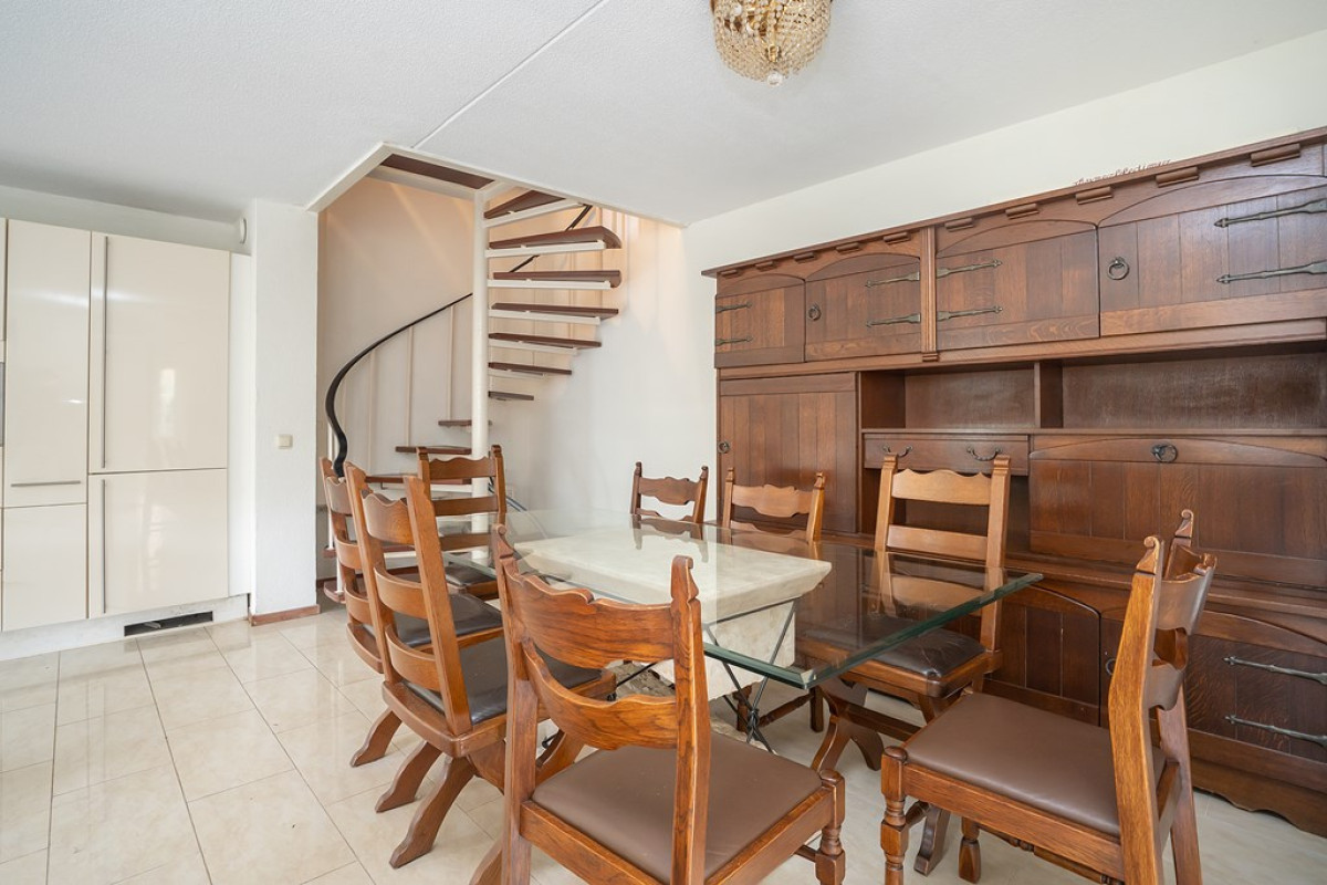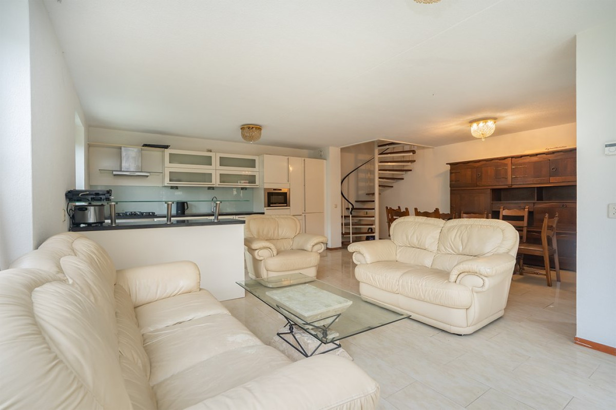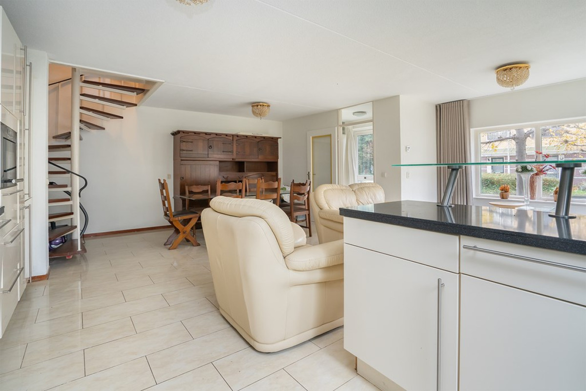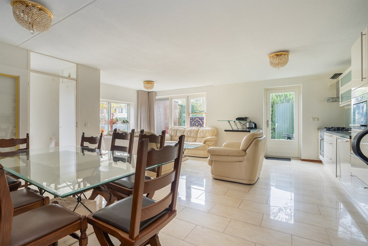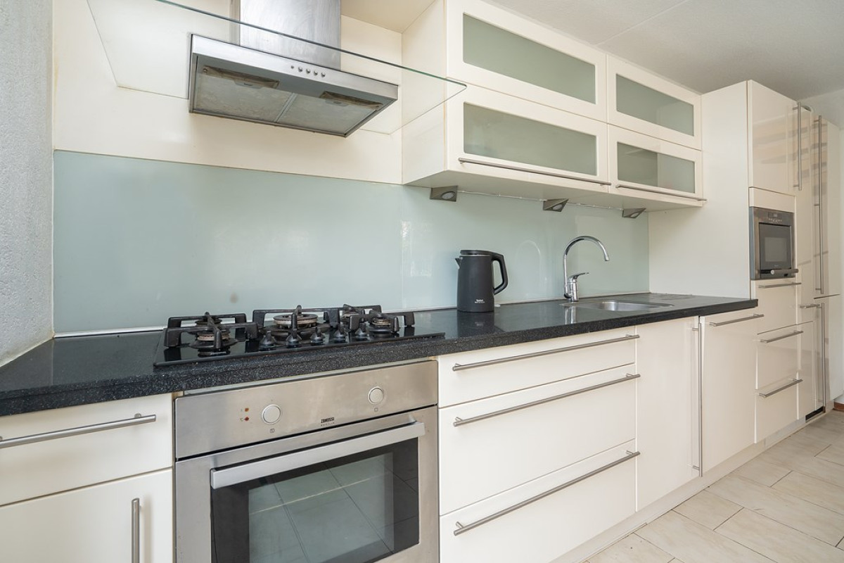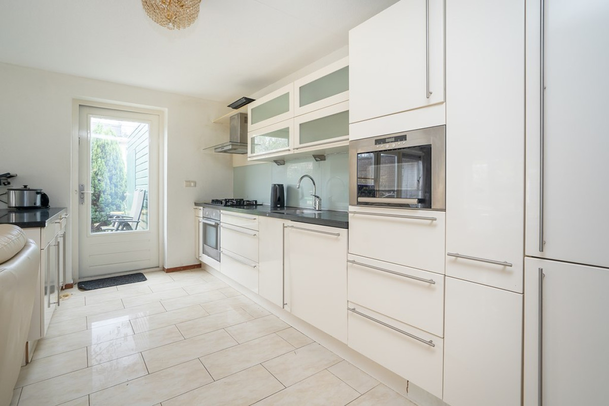 In de keuken ben je voorzien van een gaskookplaat, afzuigkap, inbouw oven, combi magnetron en inbouw koel-/vriescombinatie. Daarnaast vind je er crèmekleurige keukenkasten met chromen handvatten en een donker keukenblad. Ook de keuken leidt naar de achtertuin.