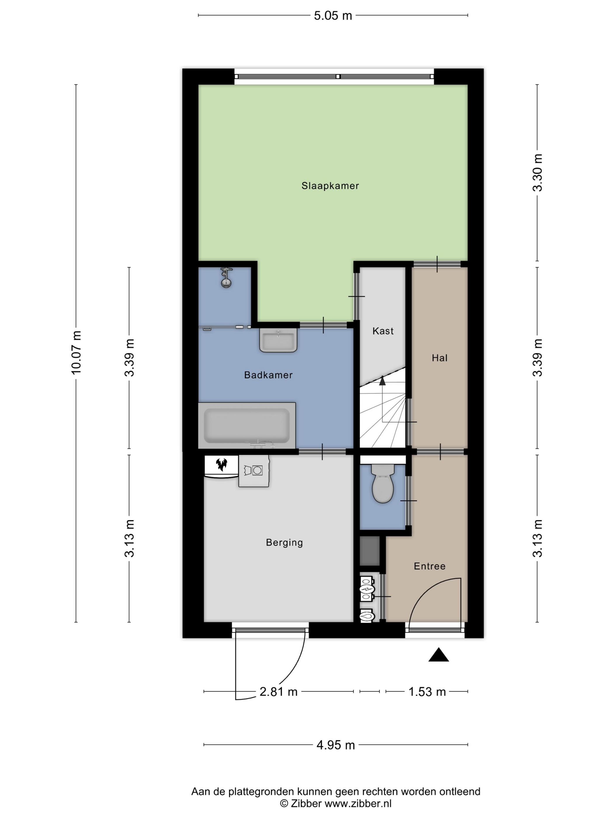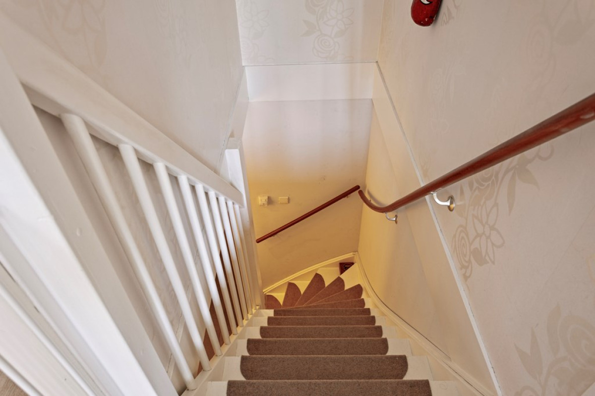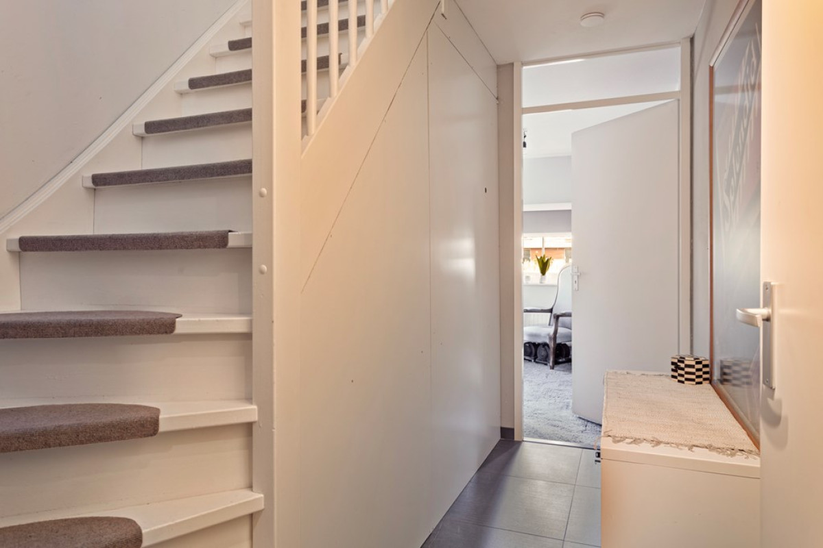 Via de voordeur kom je in de betegelde hal waar meterkast, trapopgang naar de eerste verdieping, toilet en het doorstroomapparaat (van de stadsverwarming) te vinden zijn. Vanuit de hal bereik je ook de toegangsdeur naar de slaapkamer.