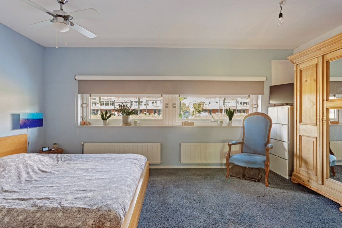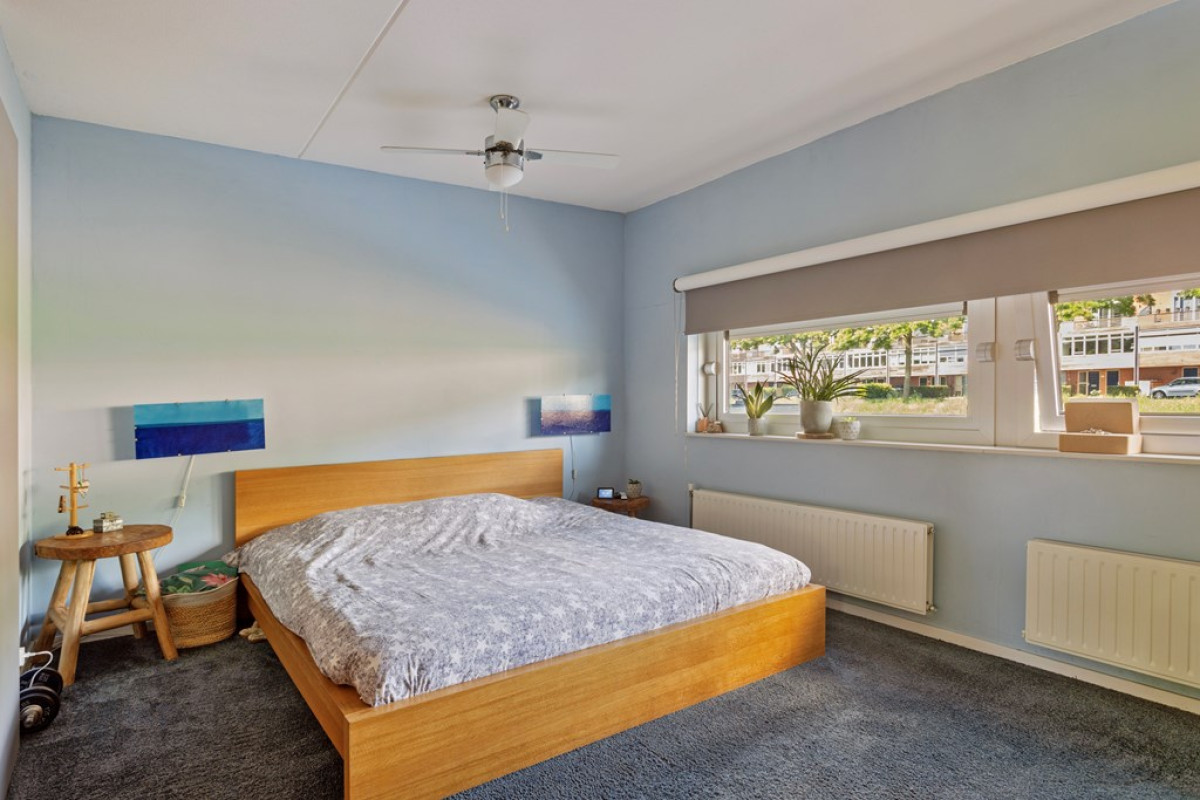 De slaapkamer is zeer ruim en het is mogelijk om hier (zoals oorspronkelijk) 2 slaapkamers van te maken. Naast een zee van ruimte is er ook een ruime inbouwkast aanwezig. En wauw! als je uit het raam kijkt, lijkt het net alsof je je op een woonboot bevindt. Met tapijt op de vloer hoef je niet bang te zijn voor koude voeten.