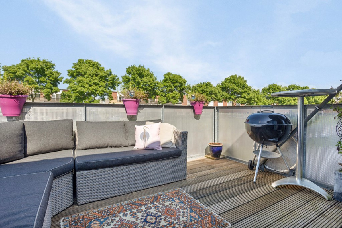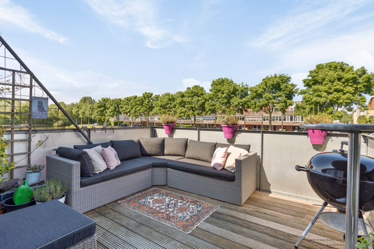 Het riante balkon is gelegen boven het water en biedt een geweldig uitzicht op water en groen. Of je nou wil relaxen, barbecueën of een hengeltje uit wil gooien…op dit fijne balkon kan het allemaal.