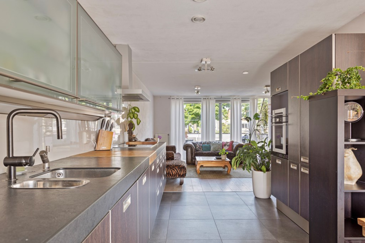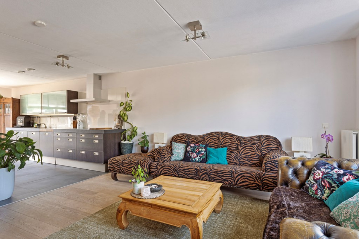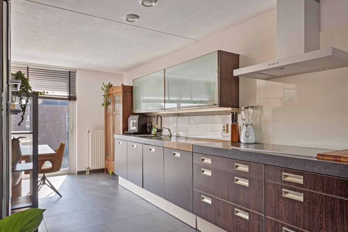 Vanuit het zitgedeelte is het balkon te bereiken en het zitgedeelte is voorzien van een mooie houten vloer. In de keuken en het eetgedeelte is de vloer betegeld.