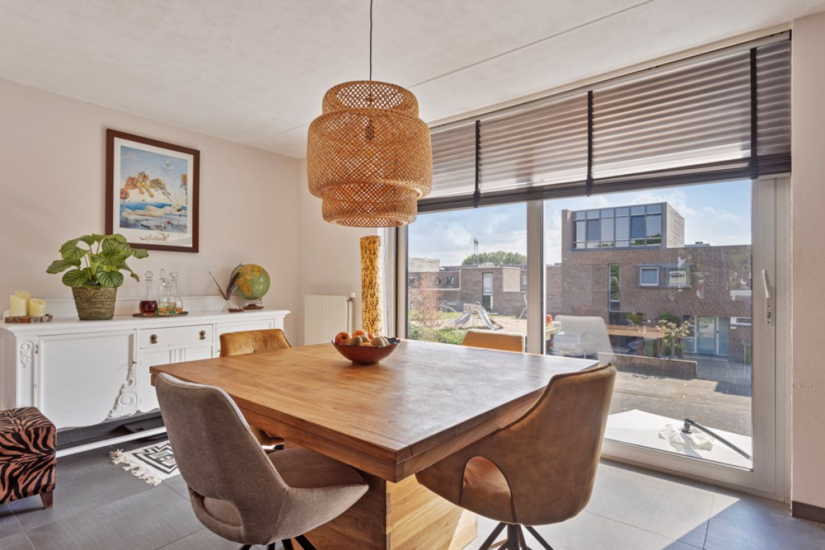 Aan de voorzijde van de woning is het ruime eetgedeelte met Frans balkon en schuifpui te vinden. Het eetgedeelte is zo ruim dat er evt. ook mogelijkheden zijn voor het creëren van bijvoorbeeld een speelhoek of werkplek.