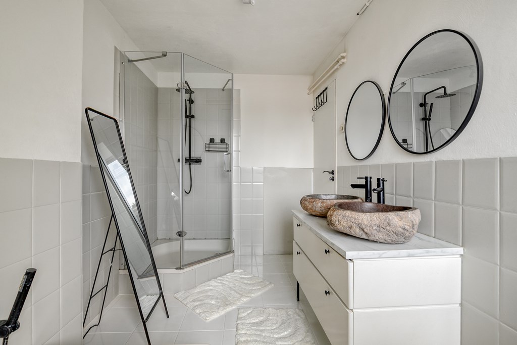 Two well-sized bedrooms, one at the front and one at the rear. The modern bathroom is equipped with a bathtub, separate shower, double sink and connections for a washing machine and dryer. The landing provides additional storage with built-in cupboards. If desired, the layout on this floor can easily be adjusted to create three bedrooms.