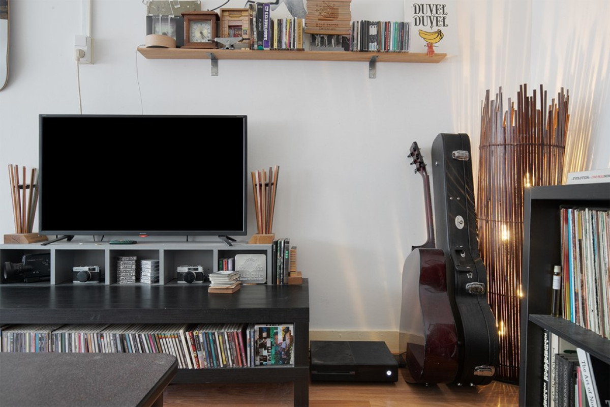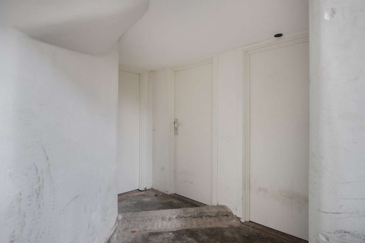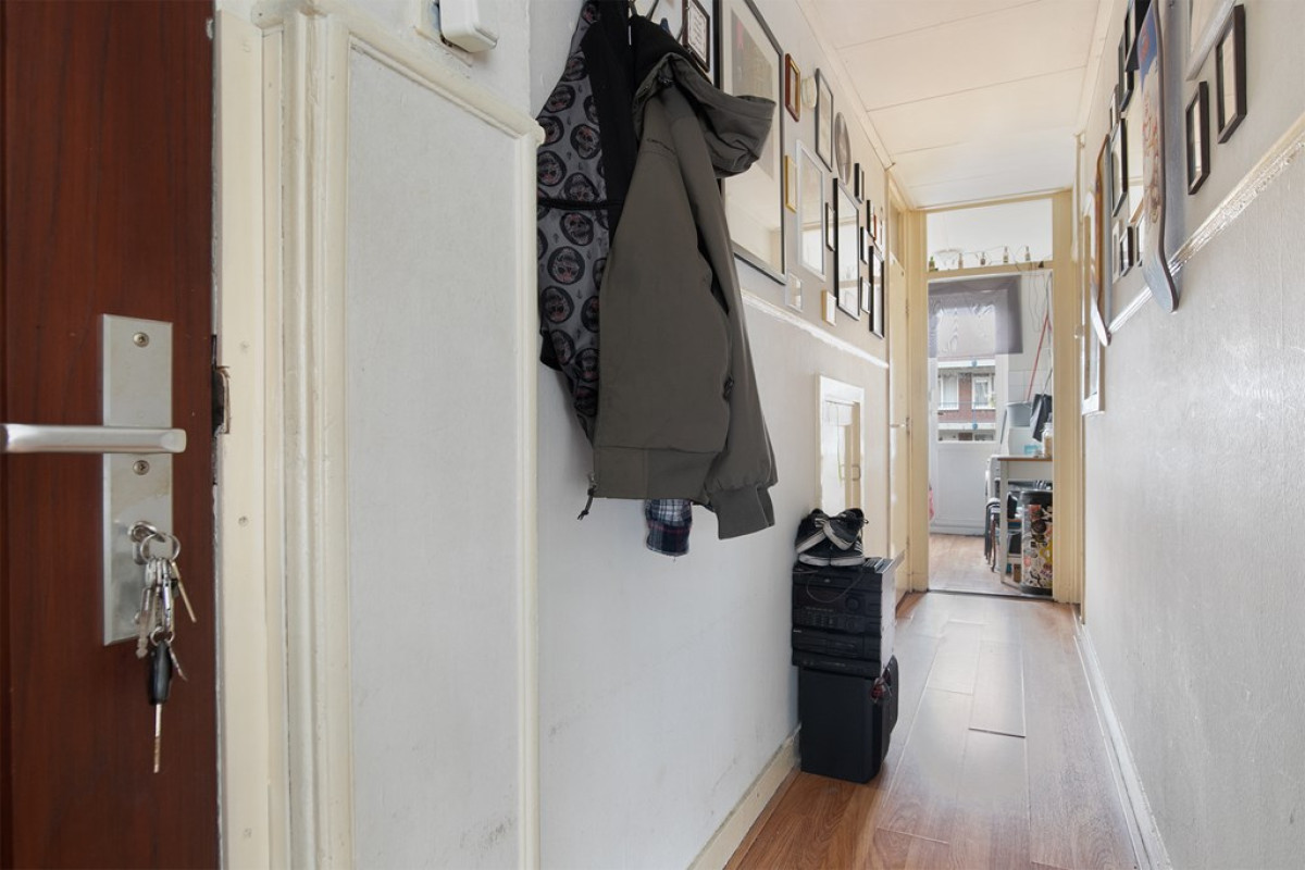 Bij binnenkomst via de straatzijde leidt een hal je naar de slaapkamer, badkamer, keuken en woonkamer.
