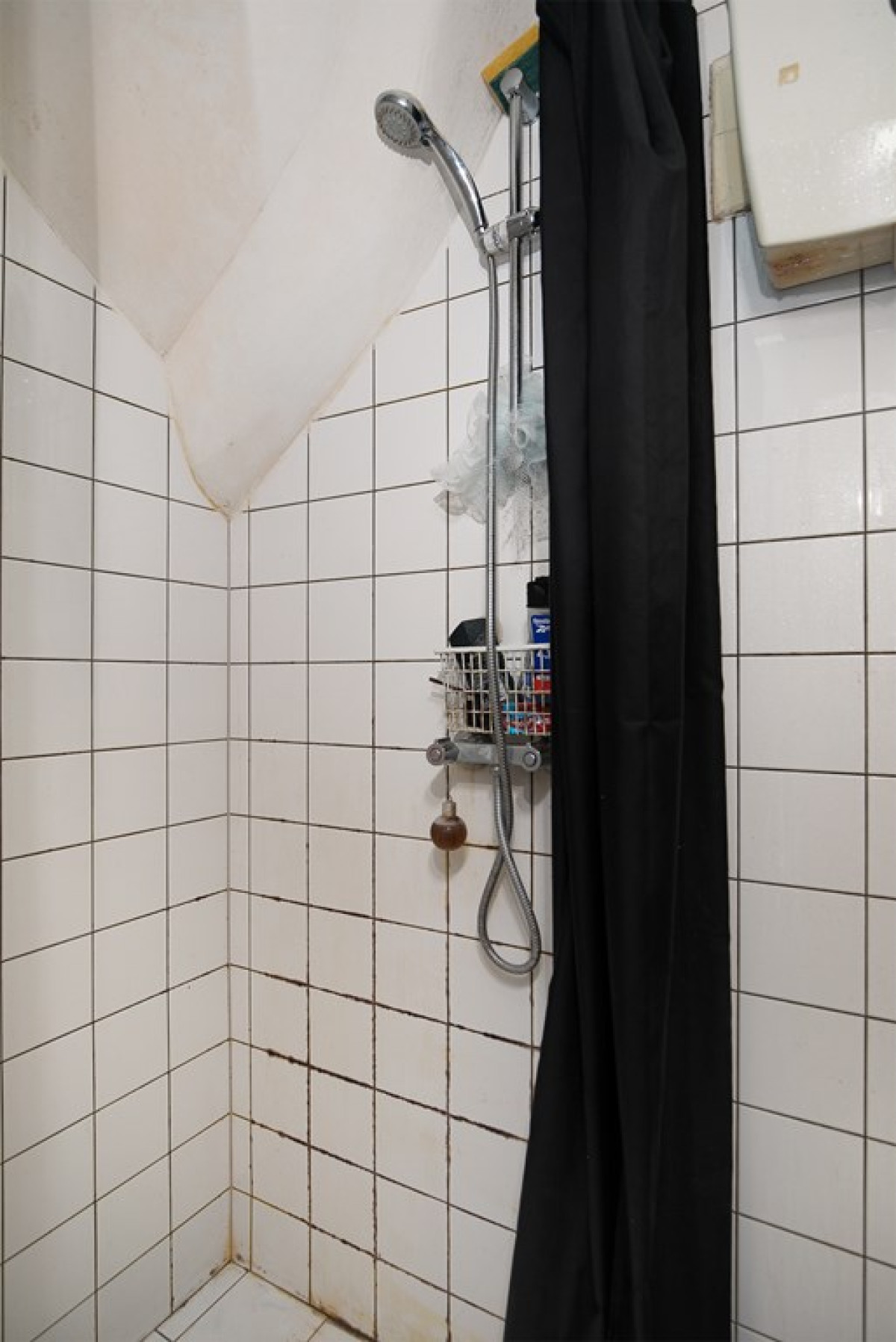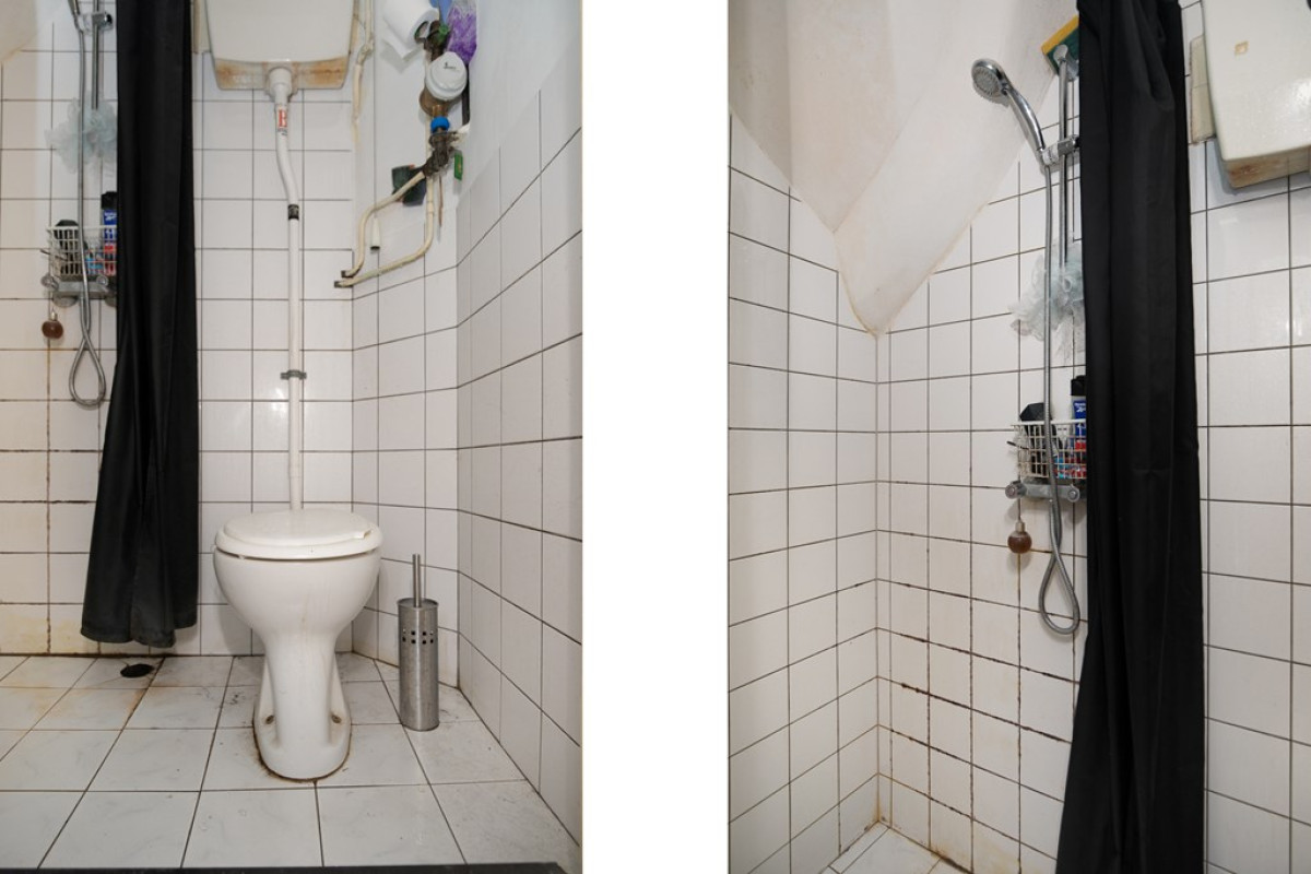De badkamer, uitgerust met een vast toilet en douche, is afgewerkt met lichte vloer- en wandtegels, wat zorgt voor een frisse uitstraling.