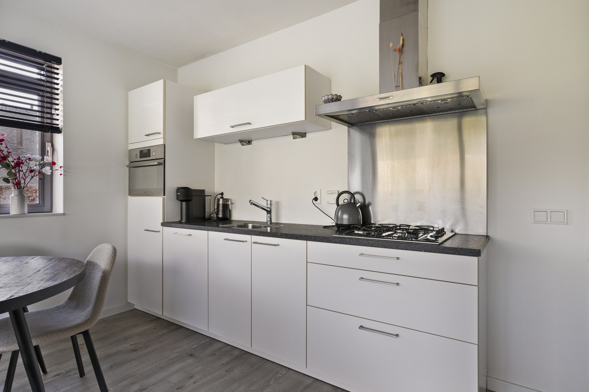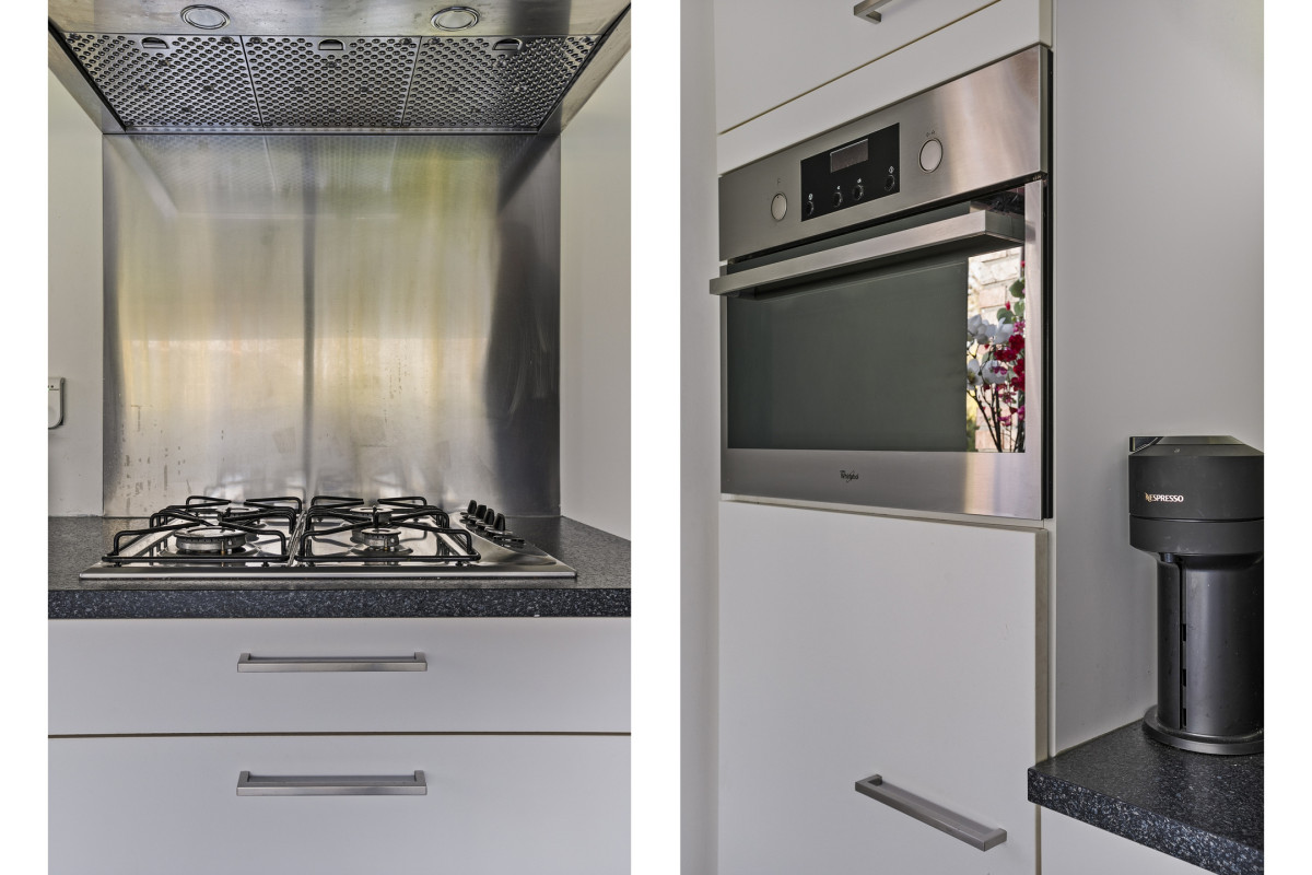 • Keuken: Moderne open keuken met inbouwapparatuur, zoals een gaskookplaat, vaatwasser, koelkast, combimagnetron en een rvs afzuigkap.