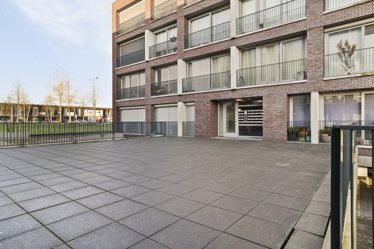 • Buitenruimte met uitzicht op groen, bereikbaar via een grote schuifpui in de woonkamer.