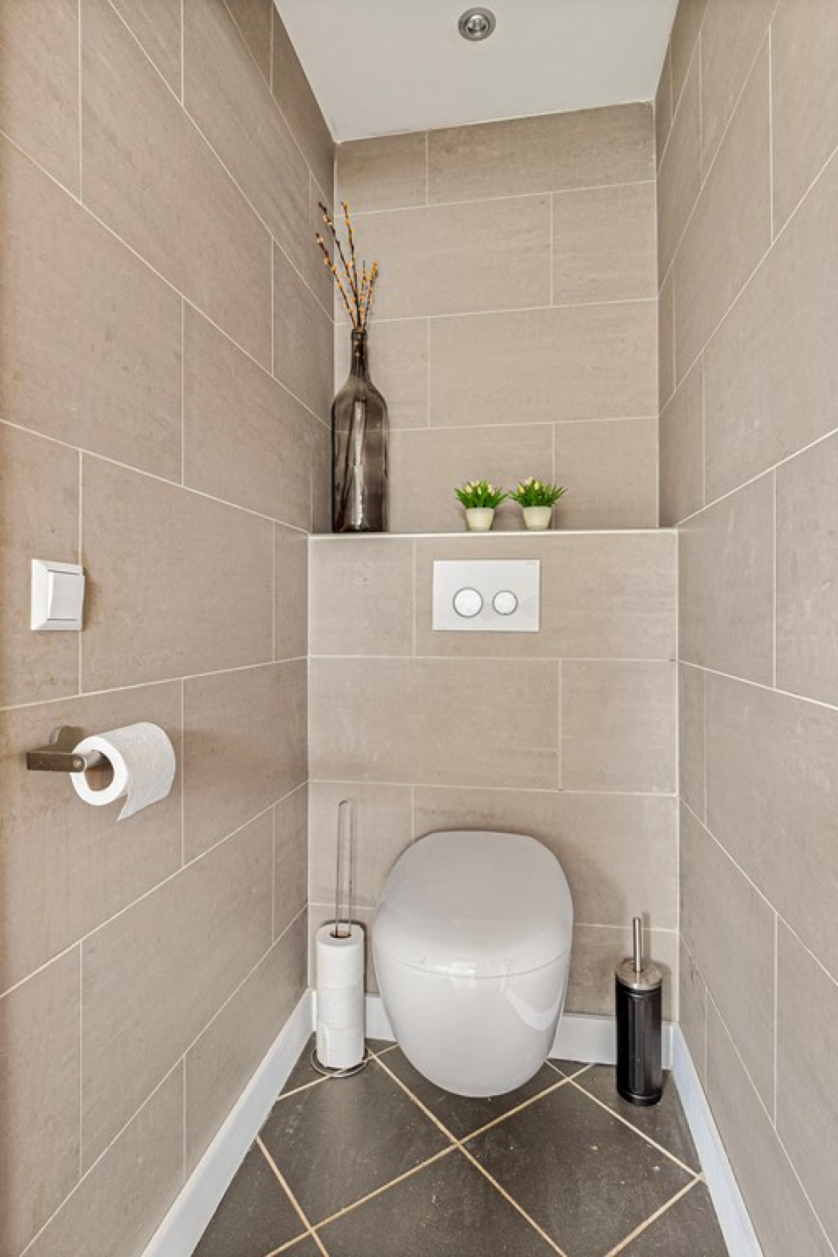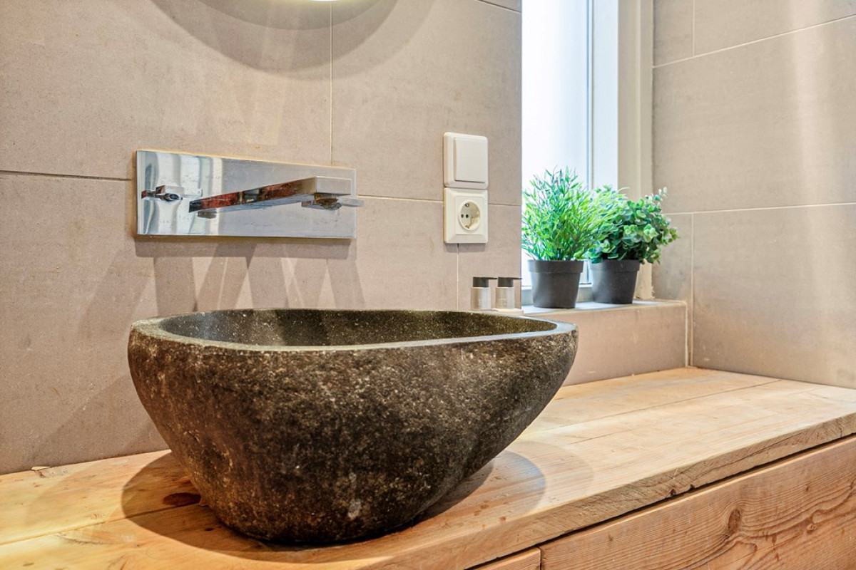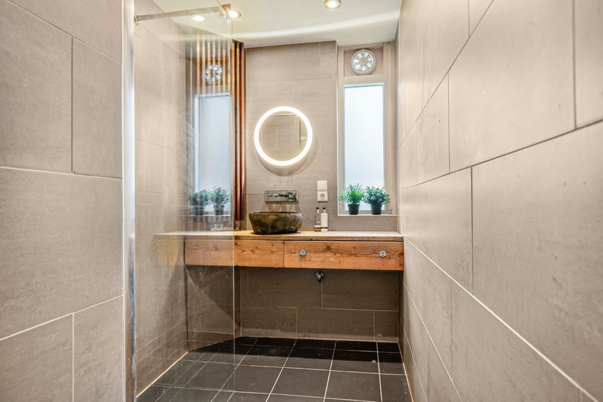De badkamer, met donkere vloertegels en beige wandtegels, combineert functionaliteit met design en biedt een verkwikkende douche-ervaring.