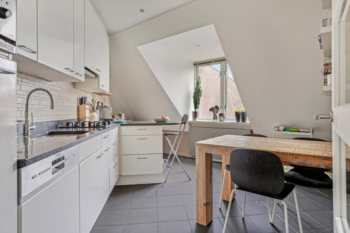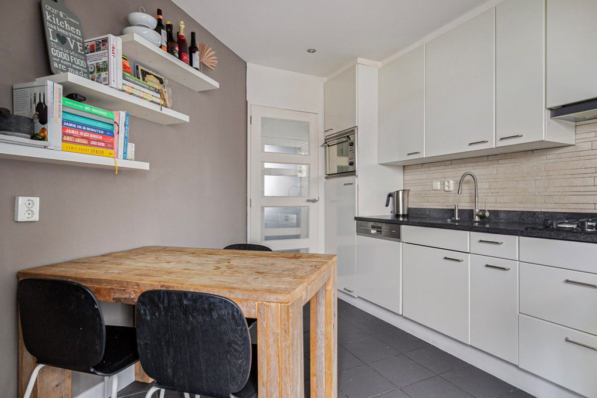 In de keuken tref je witte keukenkasten met chromen handvatten en een donker keukenblad aan. Daarnaast ben je er voorzien van een gaskookplaat, afzuigkap, vaatwasser, combi magnetron en een inbouw koel-/vriescombinatie. Ook vind je er een dakkapel en biedt de keuken ruimte om er gezellig te dineren.