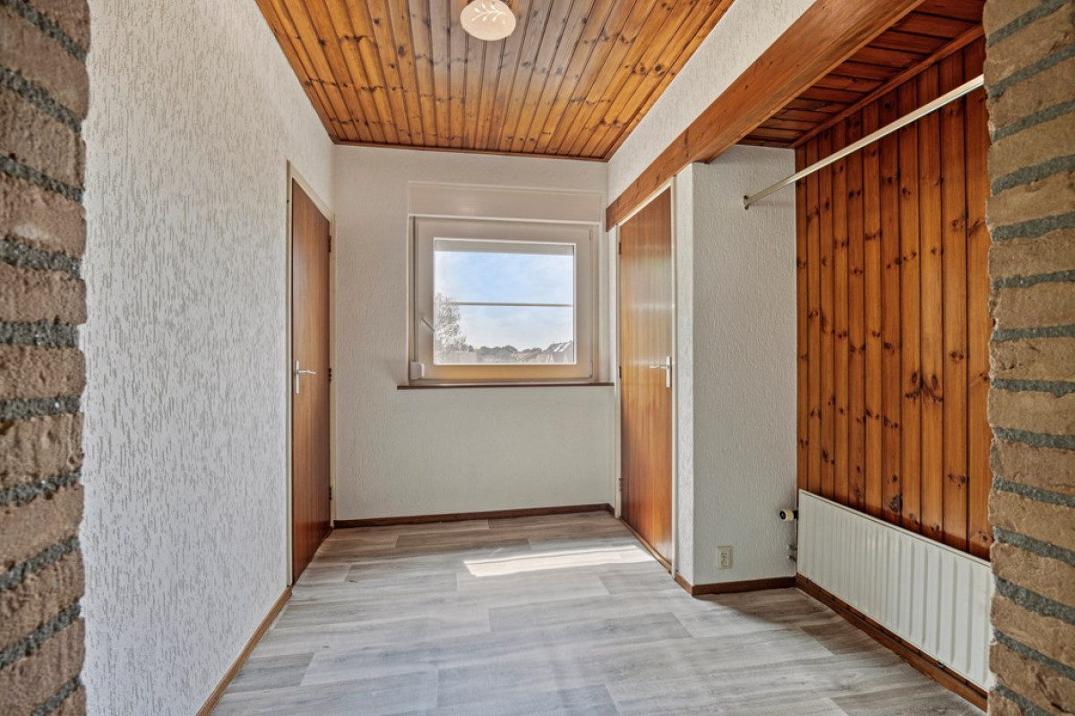 Je betreed de woning via de dubbele voordeur en komt binnen in de hal. Vanuit de hal is de meterkast, trapopgang naar de eerste verdieping en de deur naar de garage/loods te bereiken.