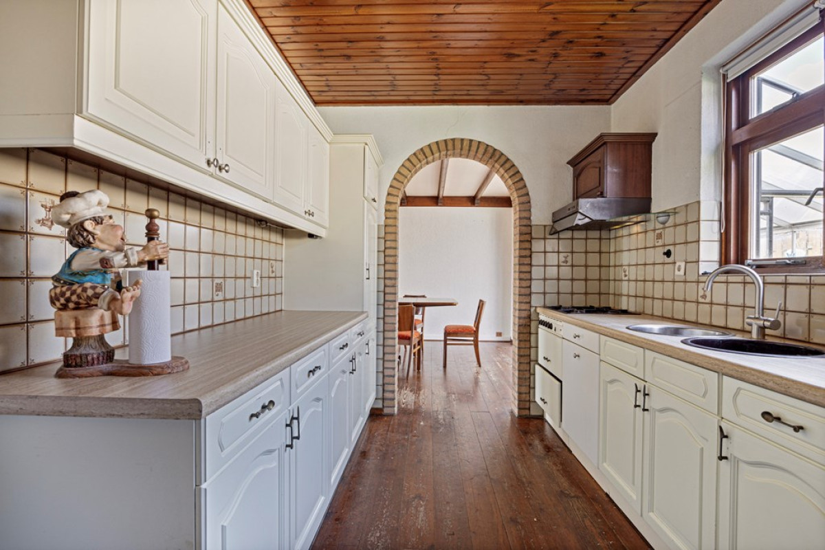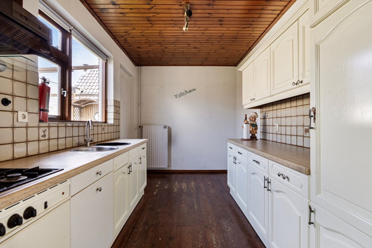 De keuken heeft aan weerszijden een rechte opstelling en is aan modernisatie toe. Het raam biedt uitzicht op het dakterras.