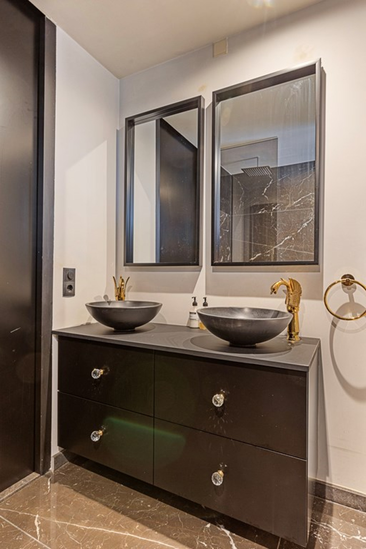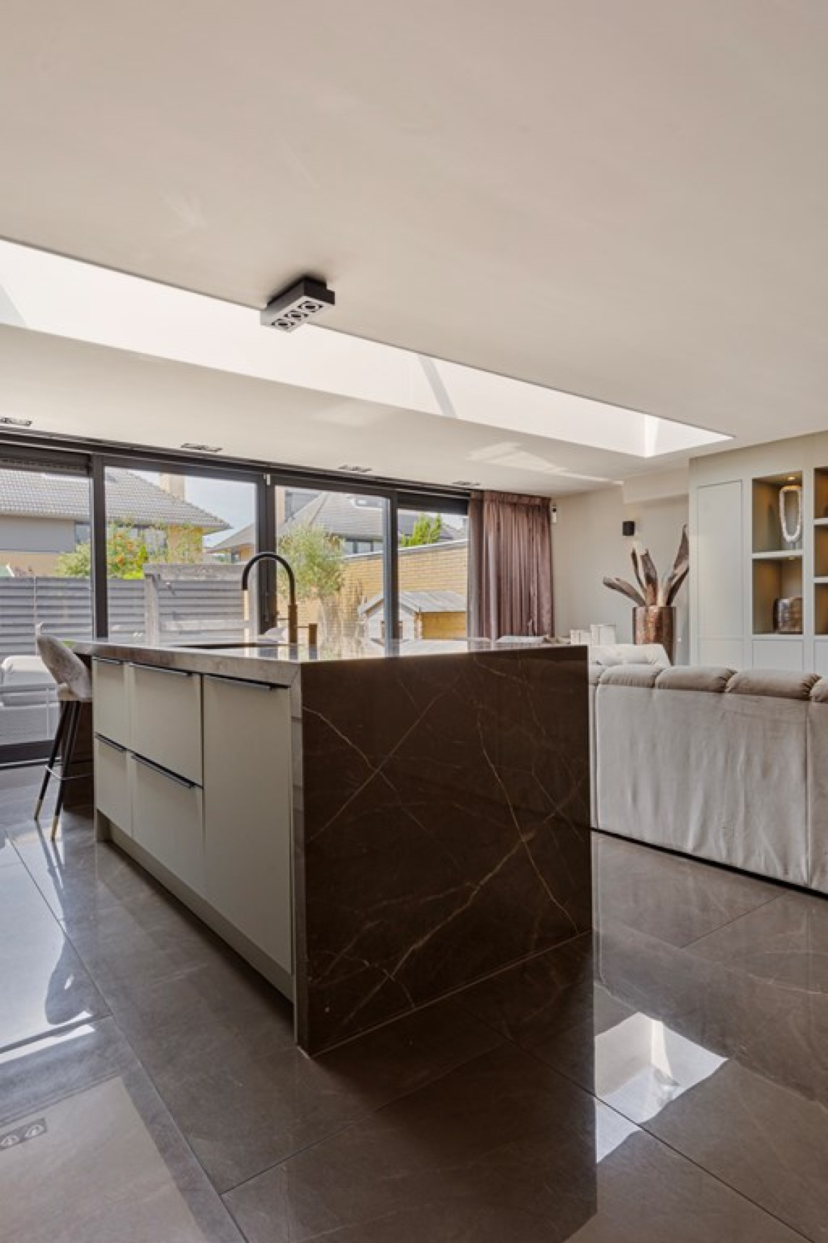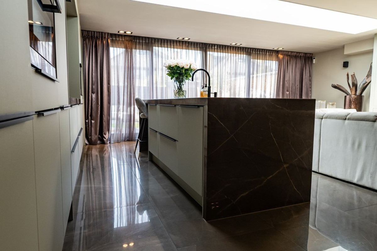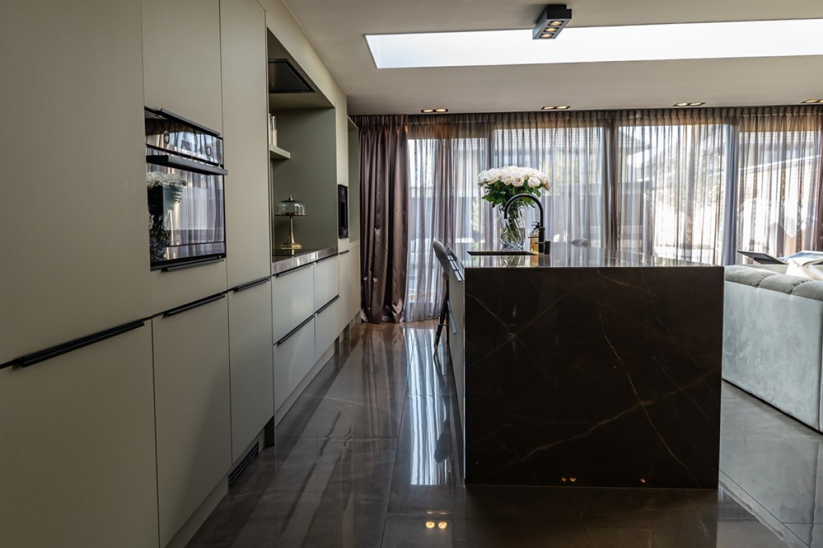 Grote Vloertegels: De keuken en aangrenzende ruimtes zijn voorzien van grote tegels van 150x75 cm, wat de ruimte een luxueuze uitstraling geeft.