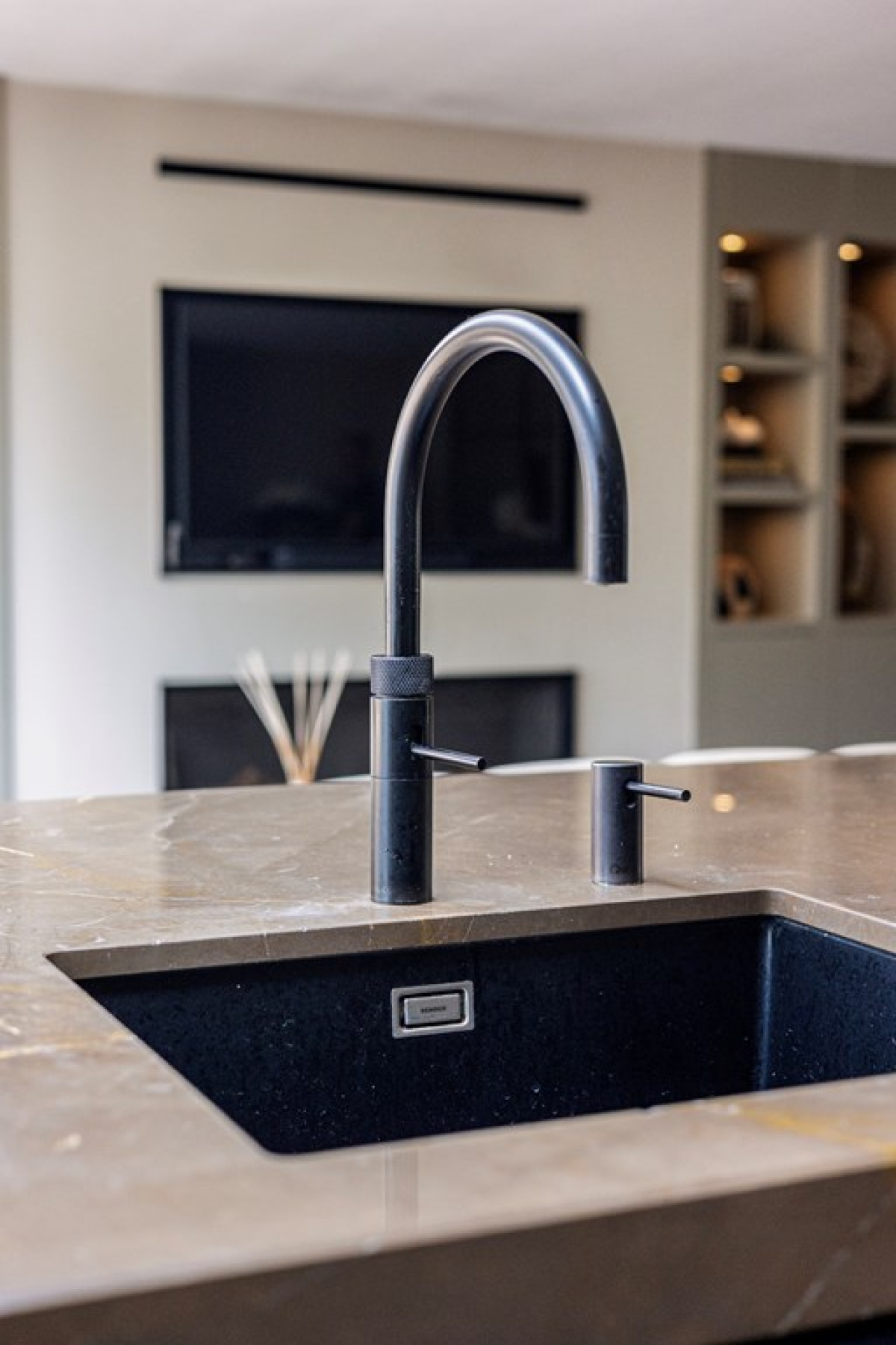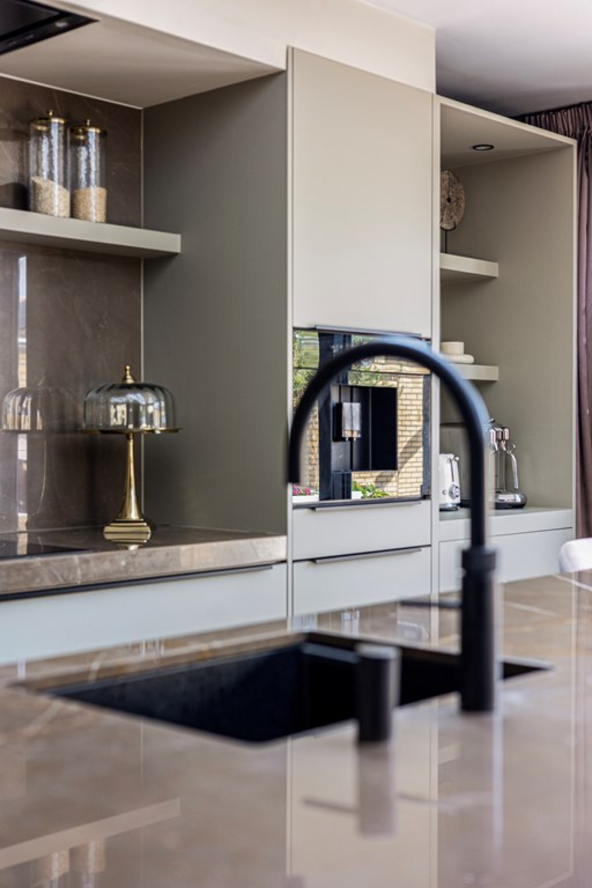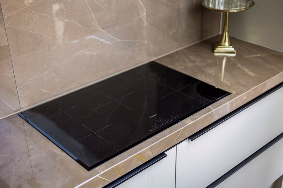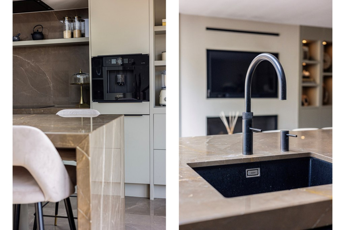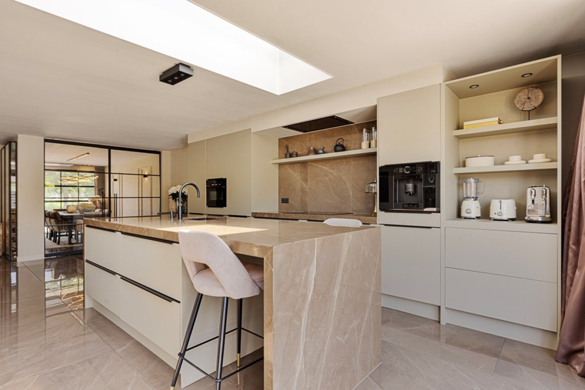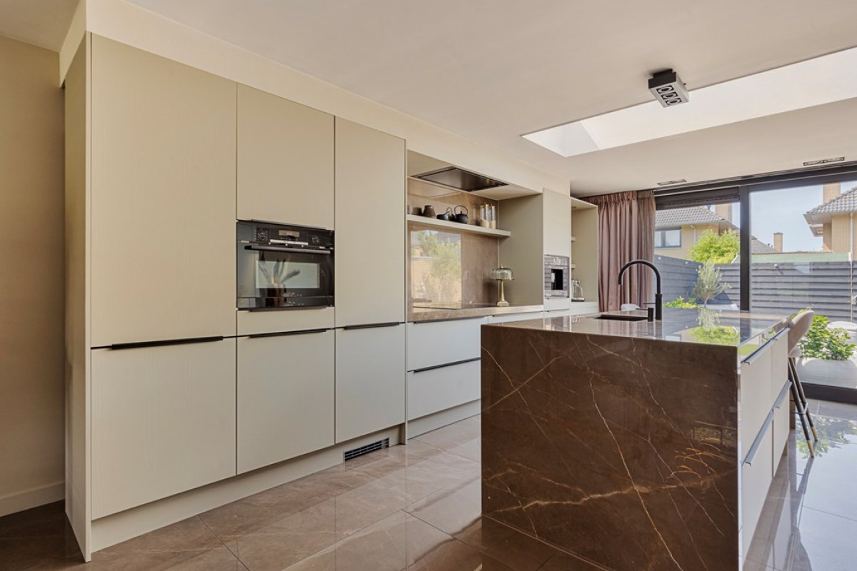Kookeiland met Marmeren Blad: De moderne keuken is uitgerust met een prachtig marmeren blad op het kookeiland, wat niet alleen esthetisch aantrekkelijk is maar ook uiterst duurzaam.