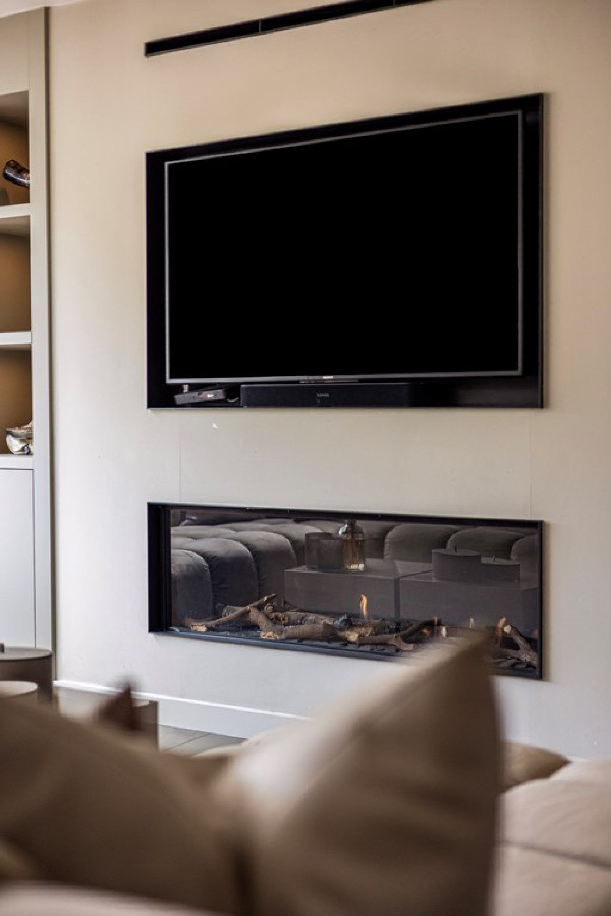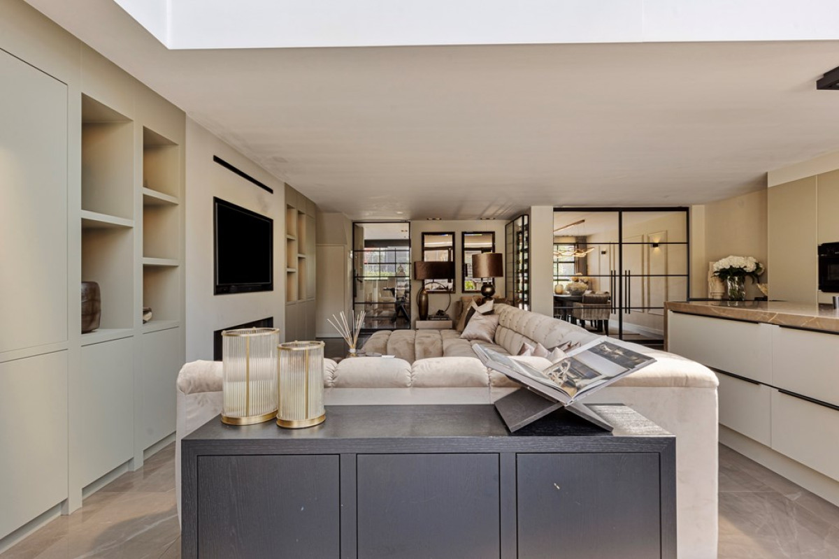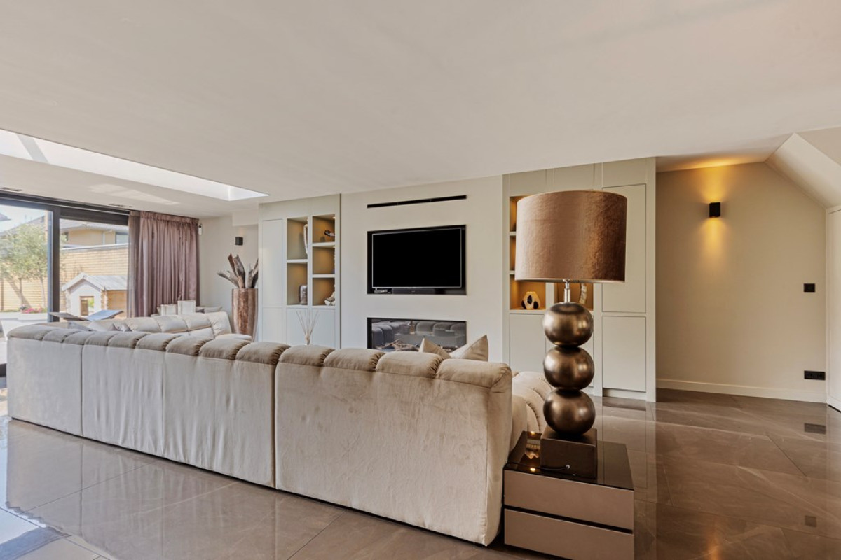 Ingebouwde Kasten: Rondom de tv en op diverse andere plekken in de woning zijn ingebouwde kasten aanwezig, die zorgen voor voldoende opbergruimte en een opgeruimd interieur.